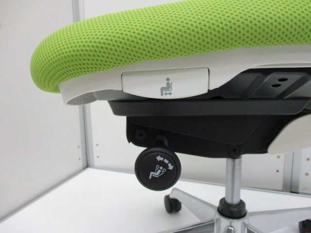 - 座面の左にあるレバー操作により、座面の奥行き調整が可能です。(ストローク:50mm)