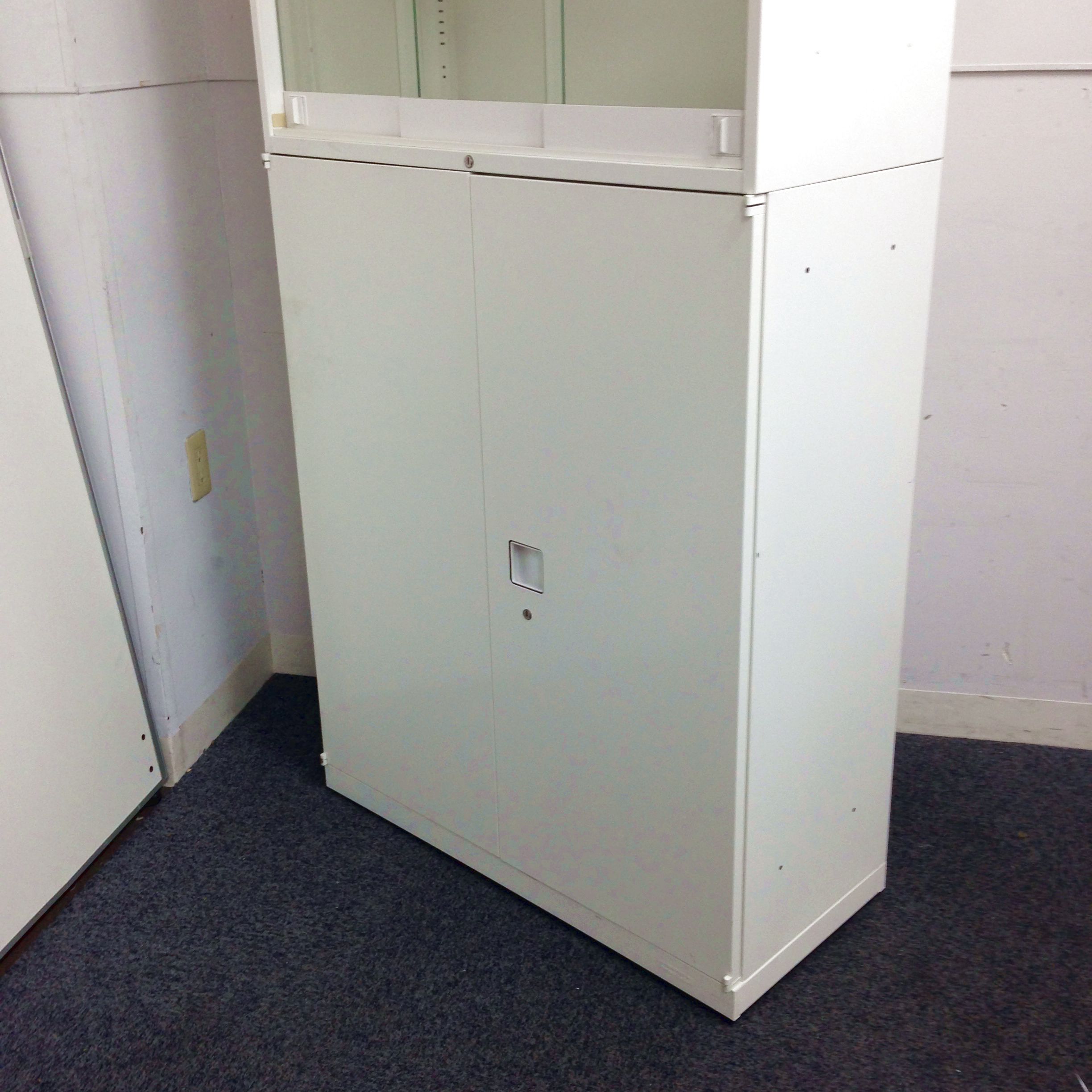 【両開きタイプで一見確認+最上段のみ浅型のクリスタルトレーのコンビ書庫!】■オカムラ製 レクトライン 上下書庫セット(上:両開き 下:クリスタルトレー)ホワイト 《オフィスバスターズ福岡博多店は、福岡を拠点として、日本全国へ中古オフィス用品・オフィス家具を提供しております》