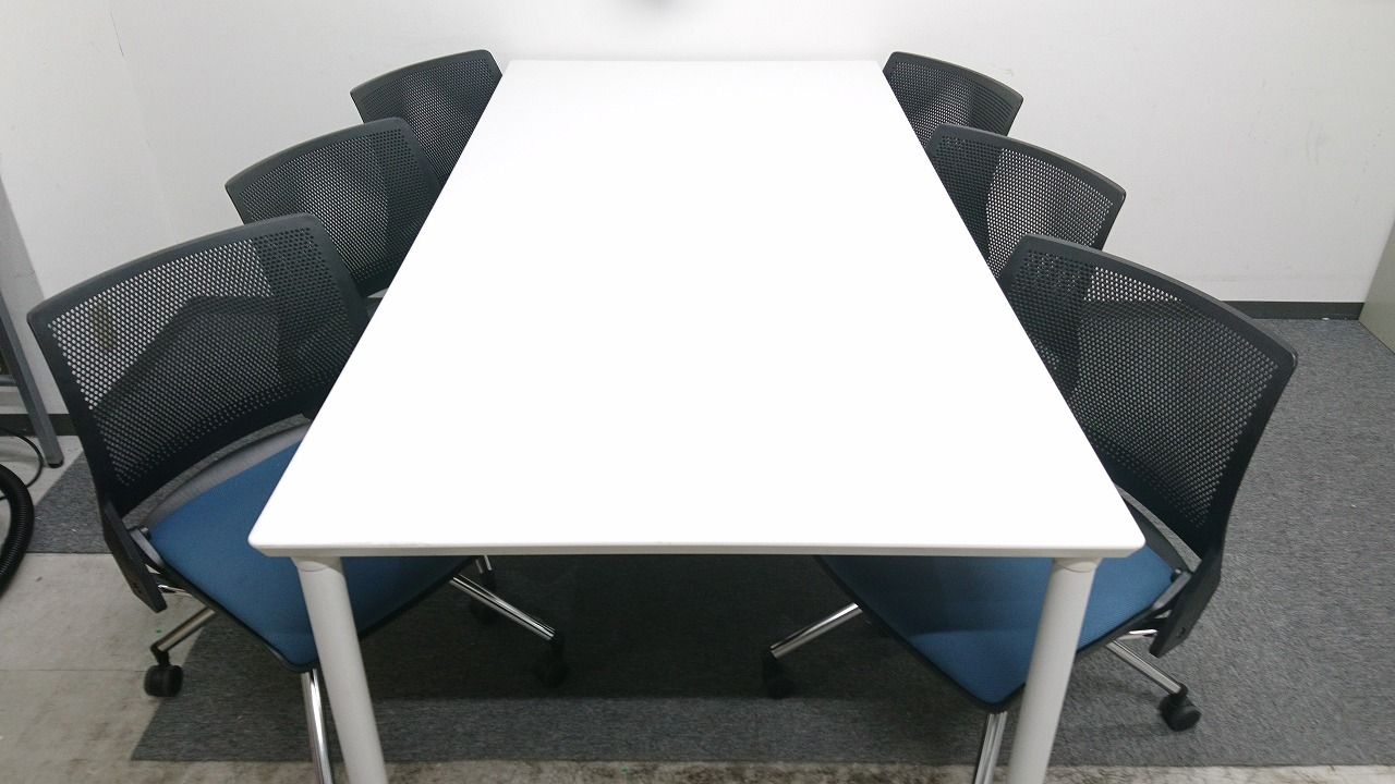 ミーティングテーブルはホワイトの幅1800と大きく今回はネスティングチェアのオカムラ製クリール6脚をお付けいたしました。