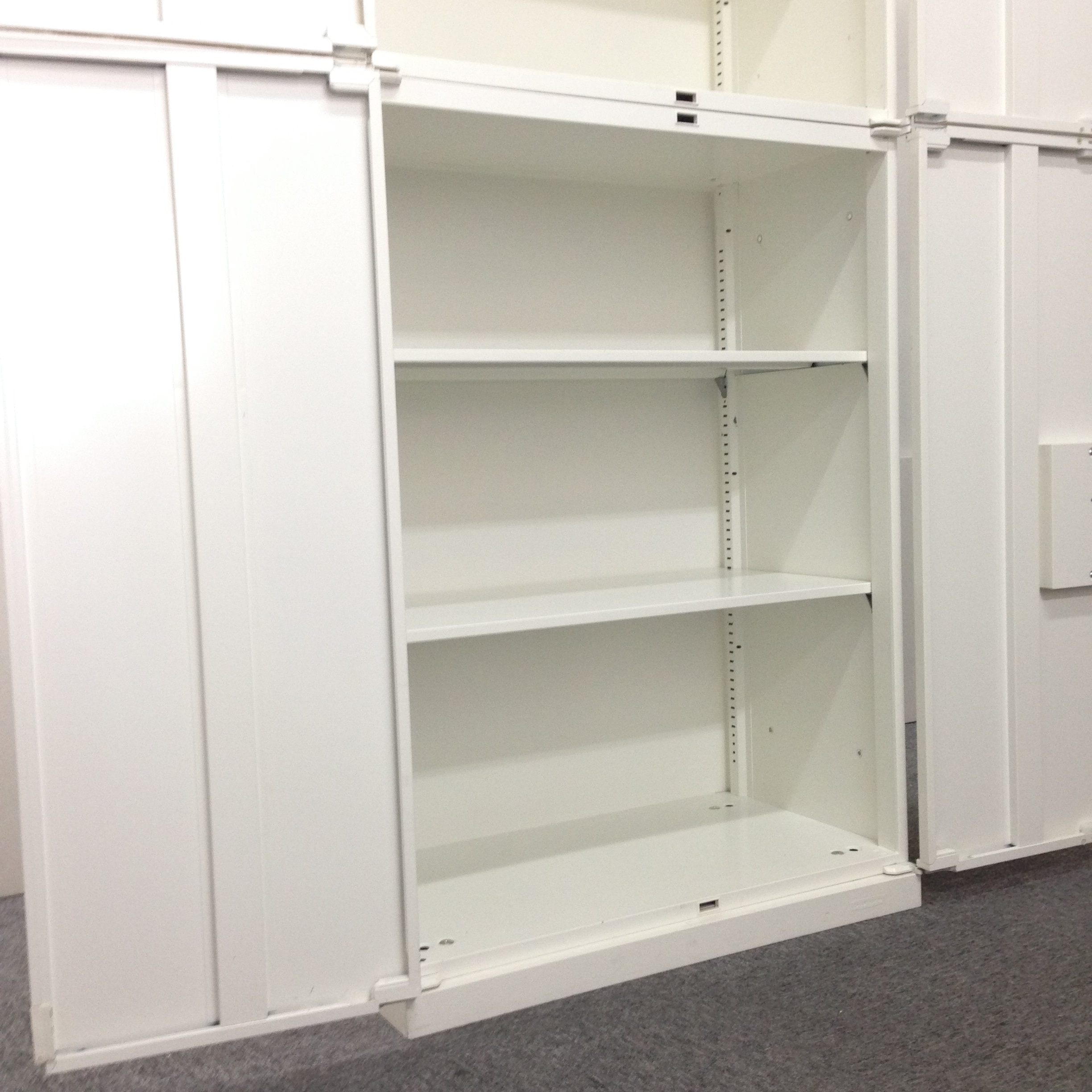 スライド式の扉+引き出しタイプの便利な書庫セットが入荷!使い勝手抜群のハイキャビネットが入荷! ■オカムラ/レクトライン/ホワイト 2枚引き戸+3段ラテラルキャビネット