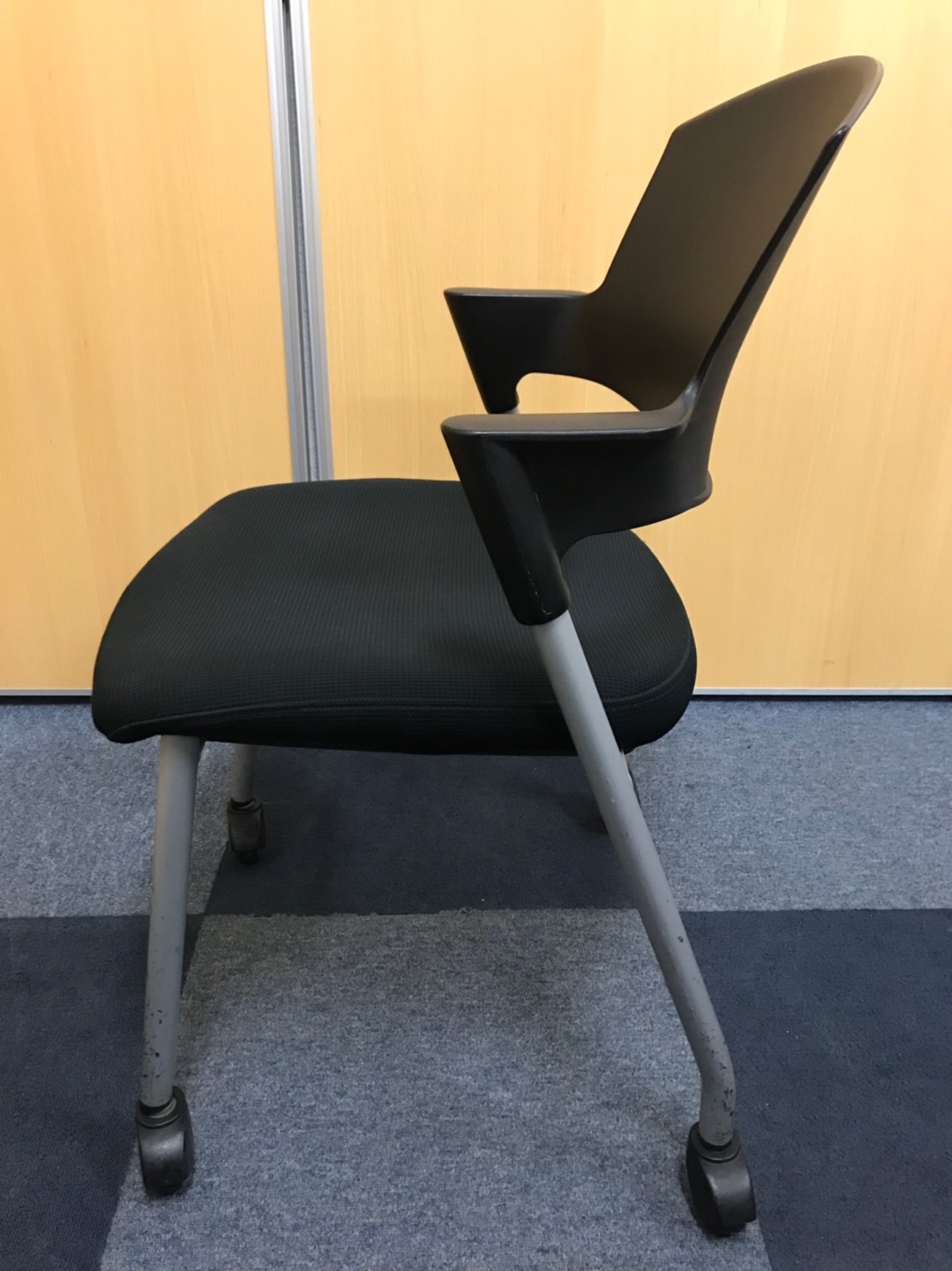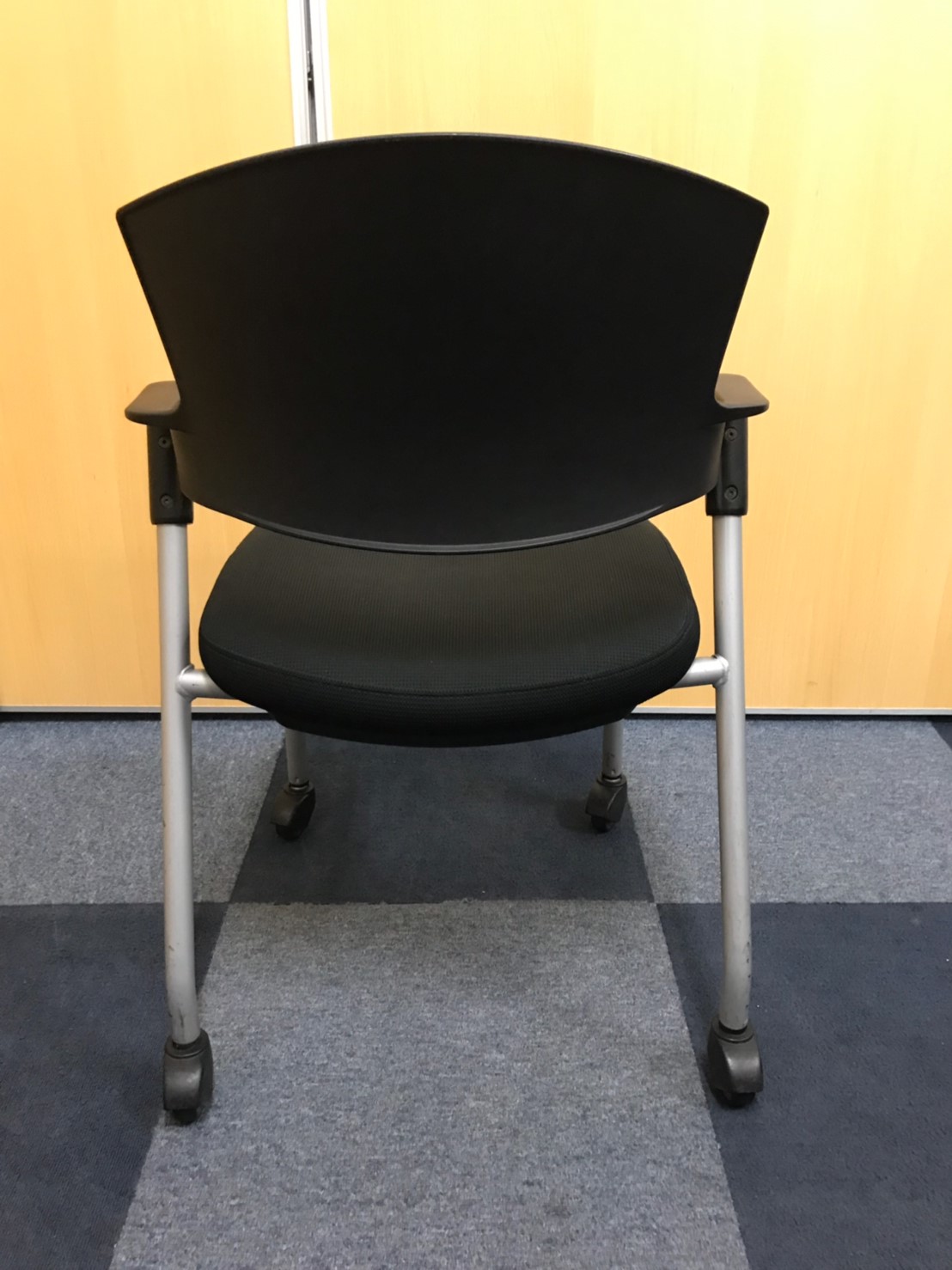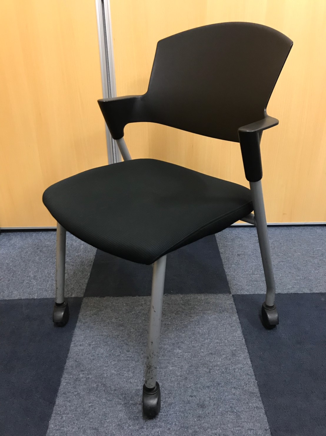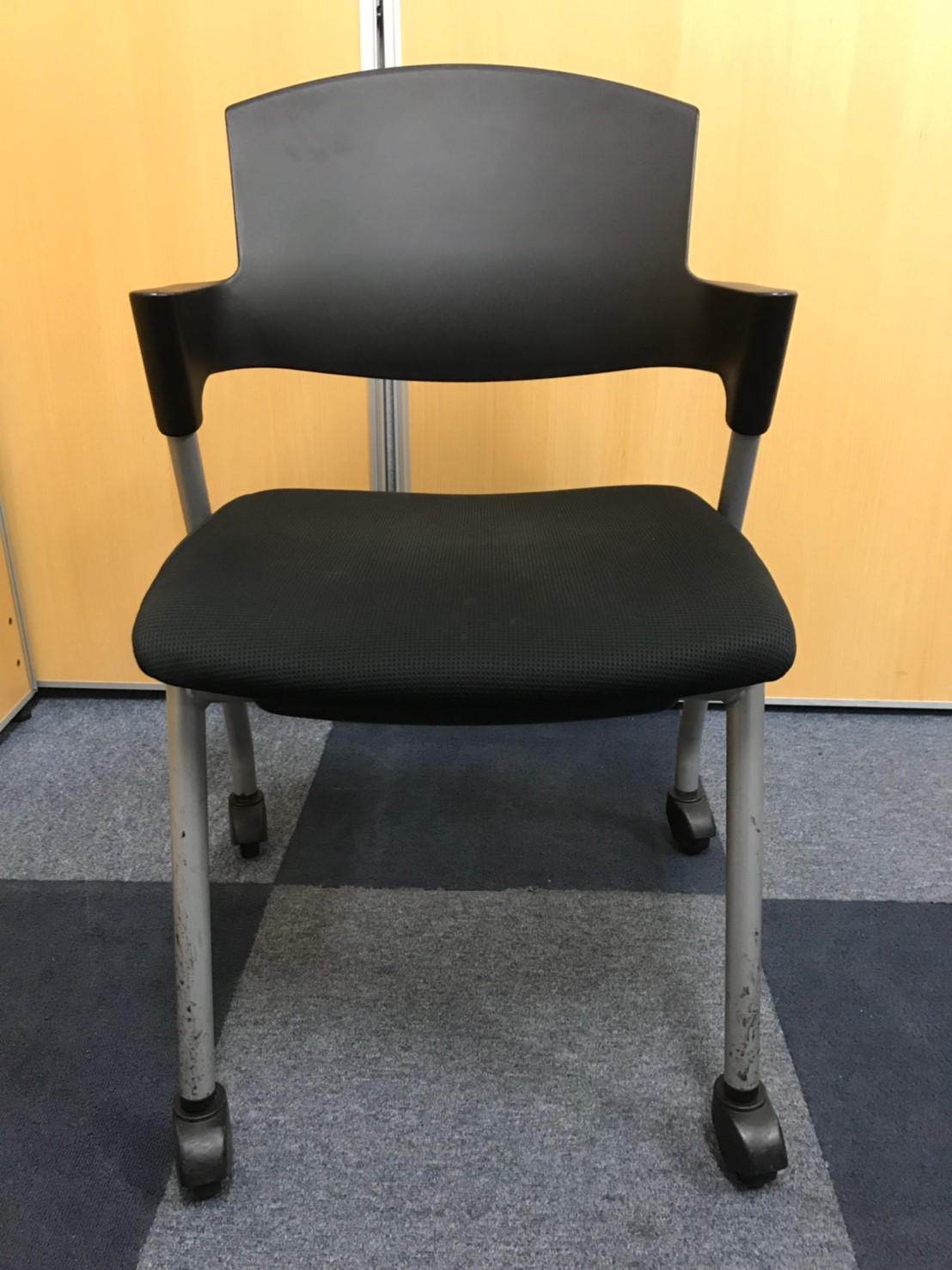 【シンプルスマートなスタッキングチェア!分厚いクッションで長時間でも快適な座り心地!】■スタッキングチェア 肘付ミーティングチェア ■固定肘 ■キャスター付 ■ブラック ■背面樹脂/コクヨ(KOKUYO/プロッティ