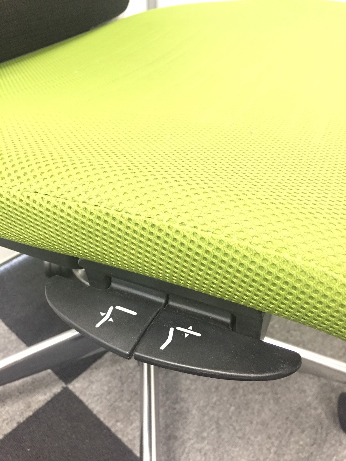 - 座る人の体格に合わせて、シート奥行きは前後54mm、高さ100mmの調整が可能です。また、調整レバーを座面シートの側面に設けることで、座ったままの姿勢で操作することができます。