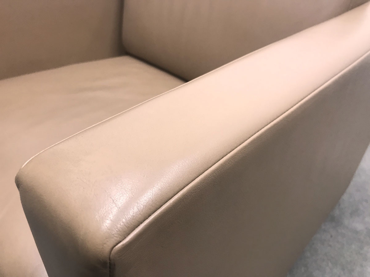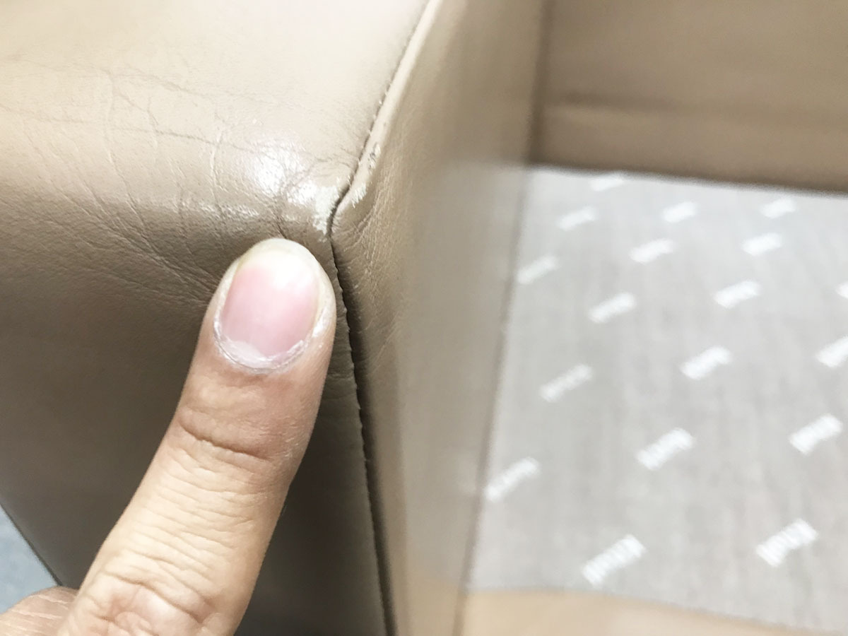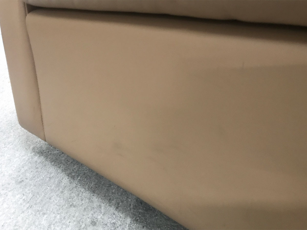 - あり黄ばみ・変色が広い範囲にうっすらある、または濃い黄ばみ・変色が一部ある。(例:三人用ソファ、二人用ソファ、一人用ソファの場合、背もたれ、肘かけ、座面等、 センターテーブルの場合、天板、脚にある。)