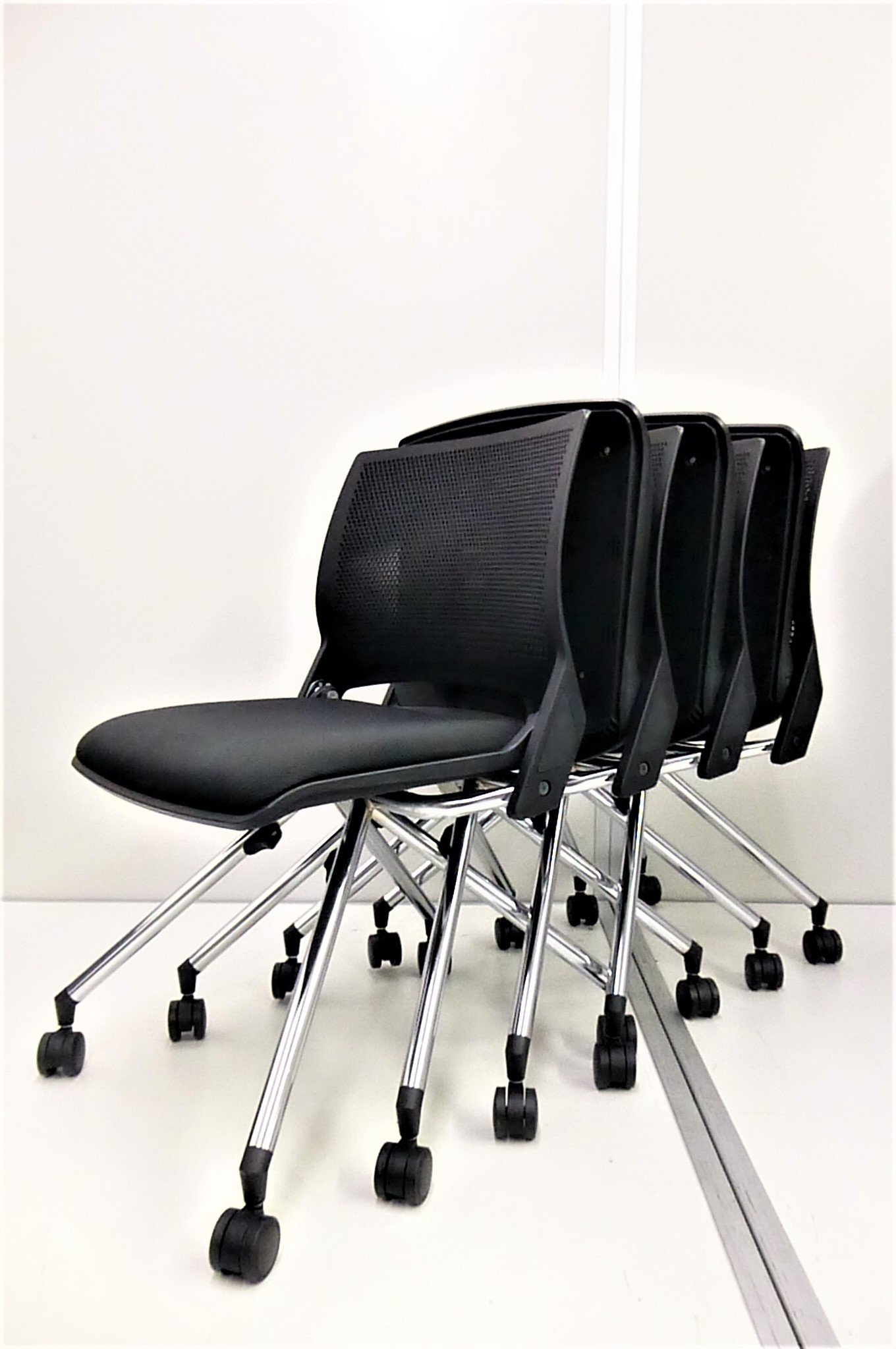 ネスティングタイプなので、座面を蹴り上げて横に収納することができるため、