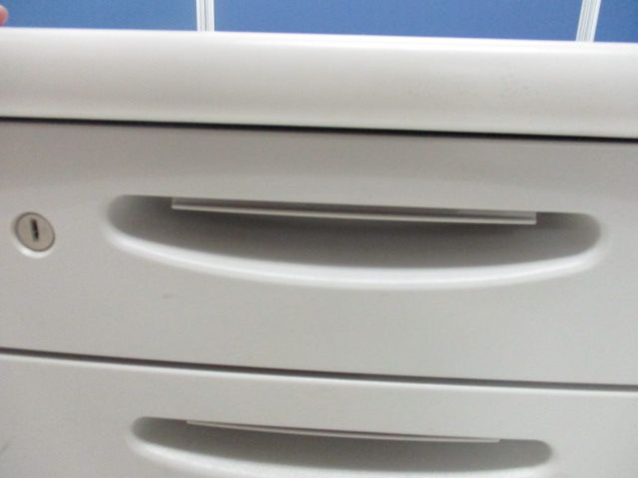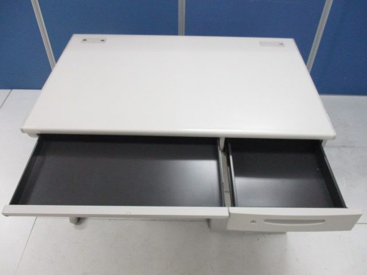 - 袖机のワゴンは、最下段がロング引出しになっており、従来より収納力120%アップ。