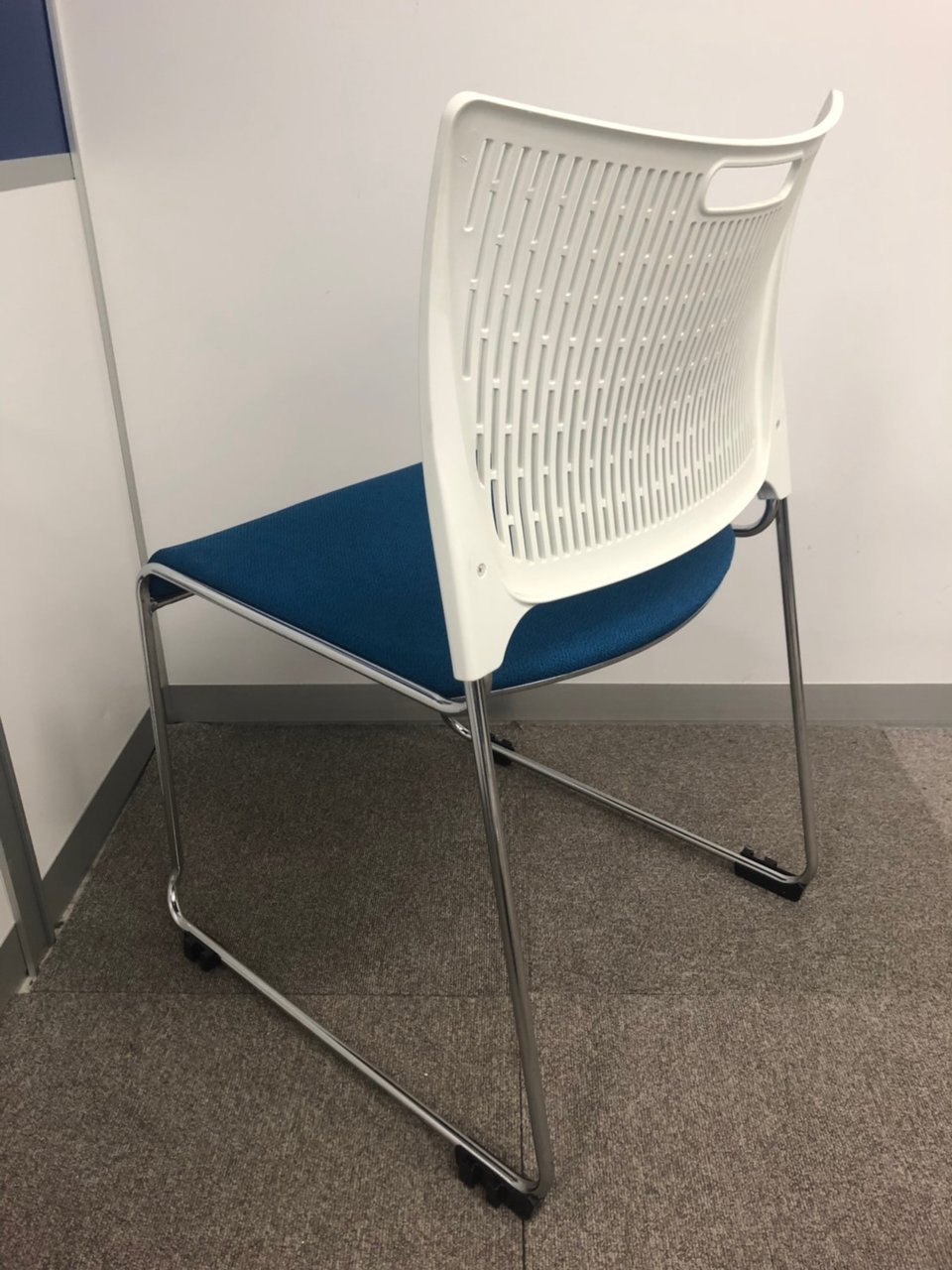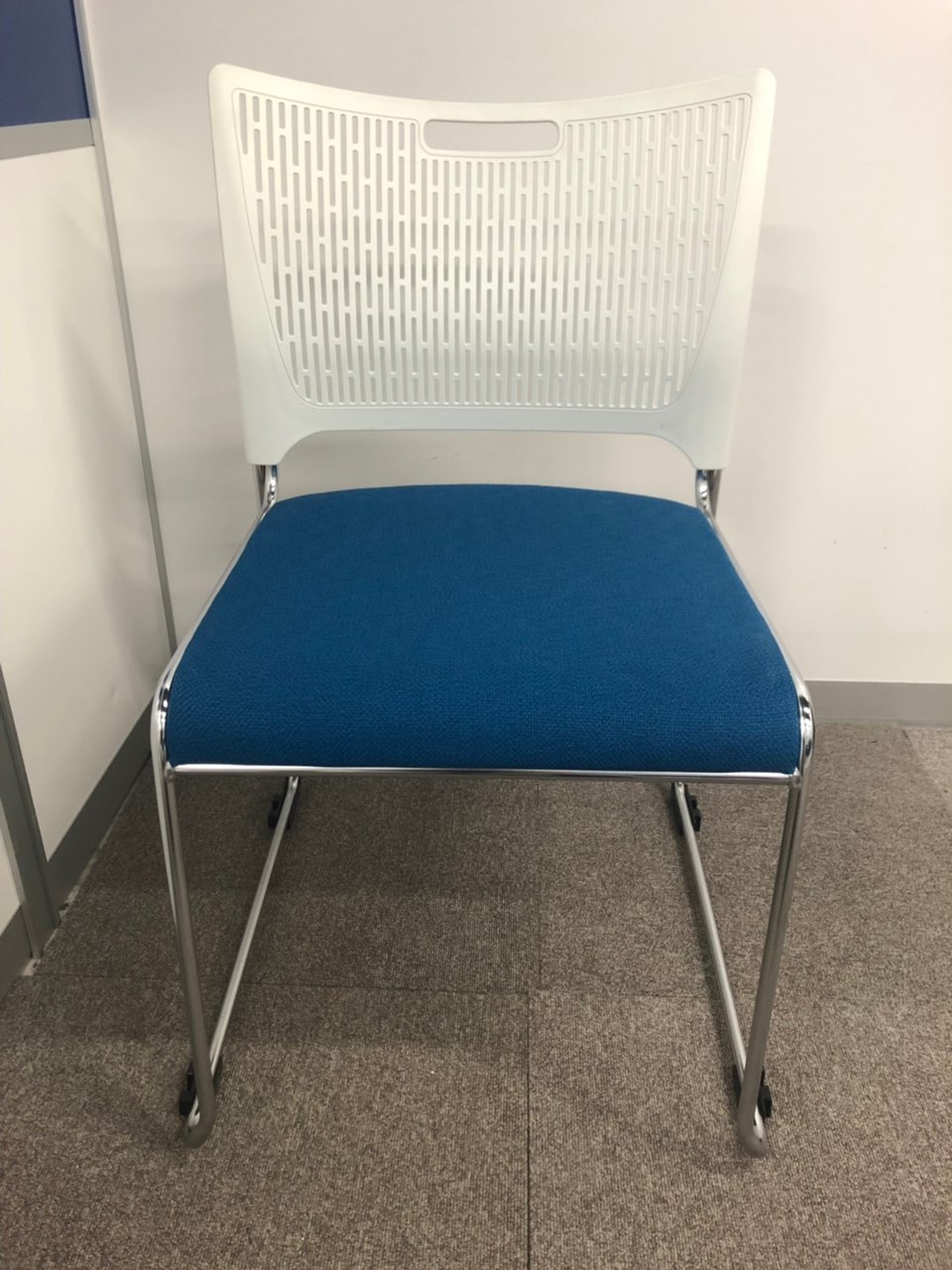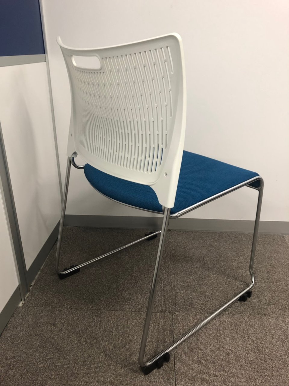 【重ねて収納可能!さわやかなカラーとシンプルデザイン!】■オカムラ製 レーテ スタッキングチェア ミーティングチェア ■キャスター付き ■座面ブルー×背面ホワイト【2412】弊社使用欄【A00990049】