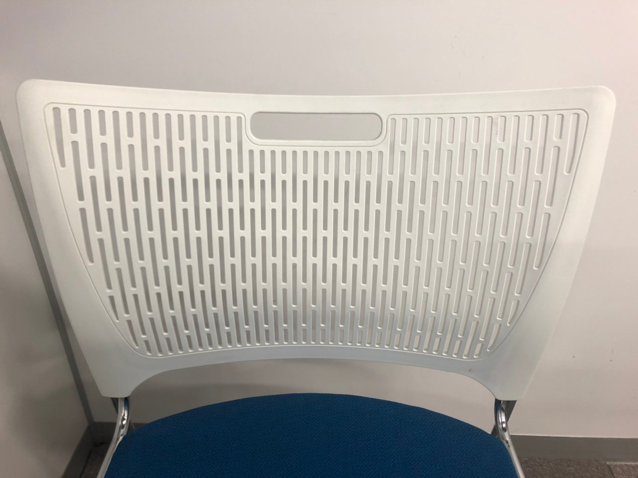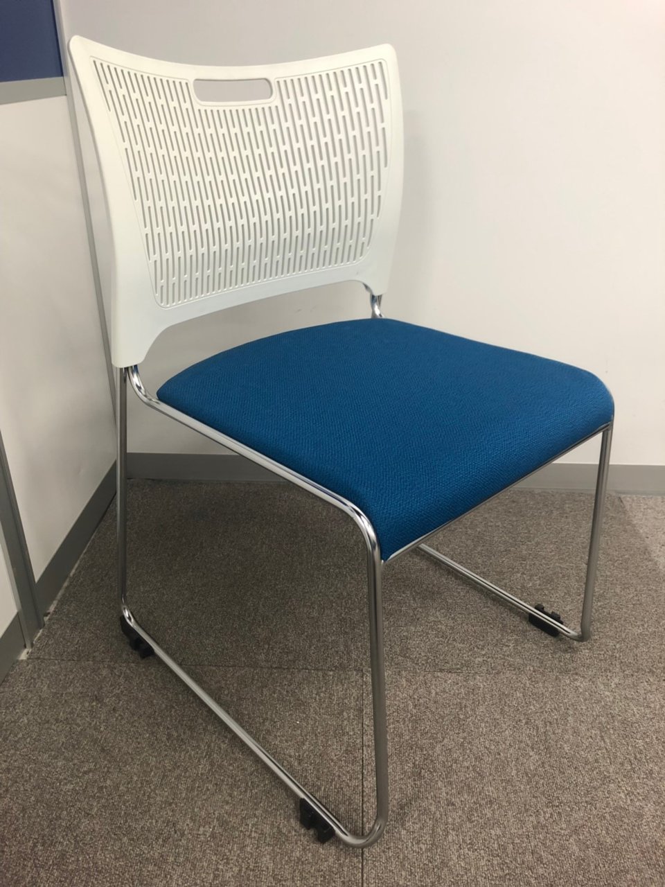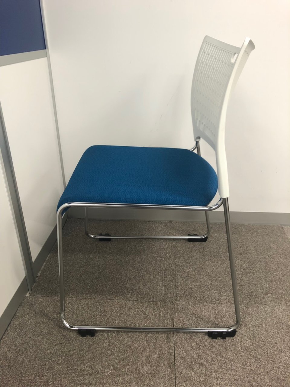 【重ねて収納可能!さわやかなカラーとシンプルデザイン!】■オカムラ製 レーテ スタッキングチェア ミーティングチェア ■キャスター付き ■座面ブルー×背面ホワイト【2412】弊社使用欄【A00990049】