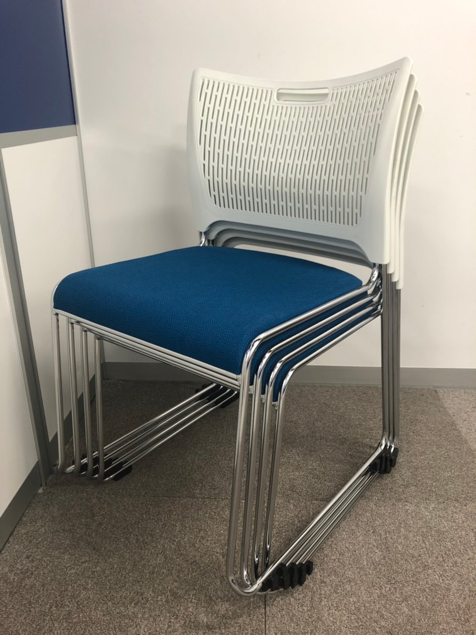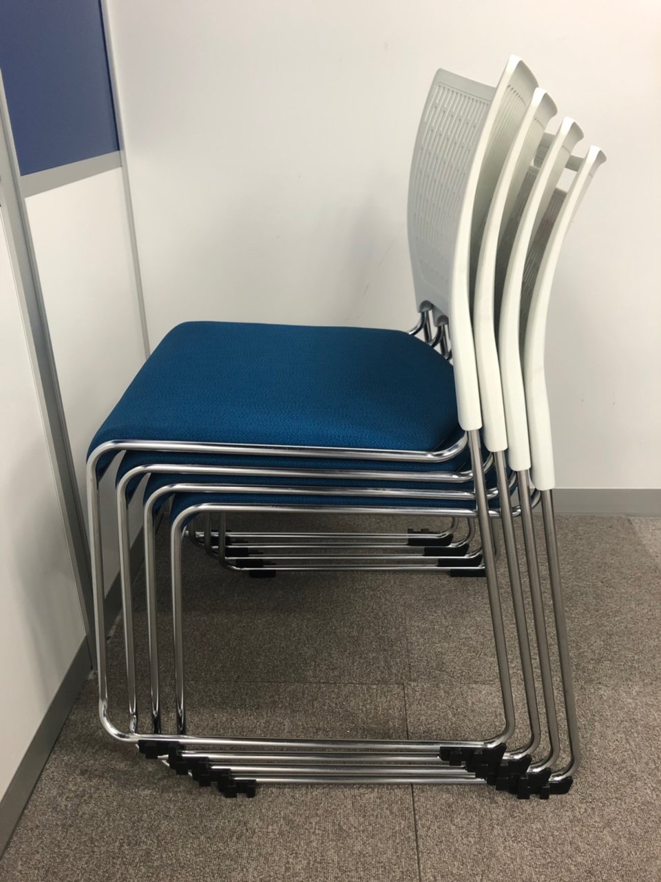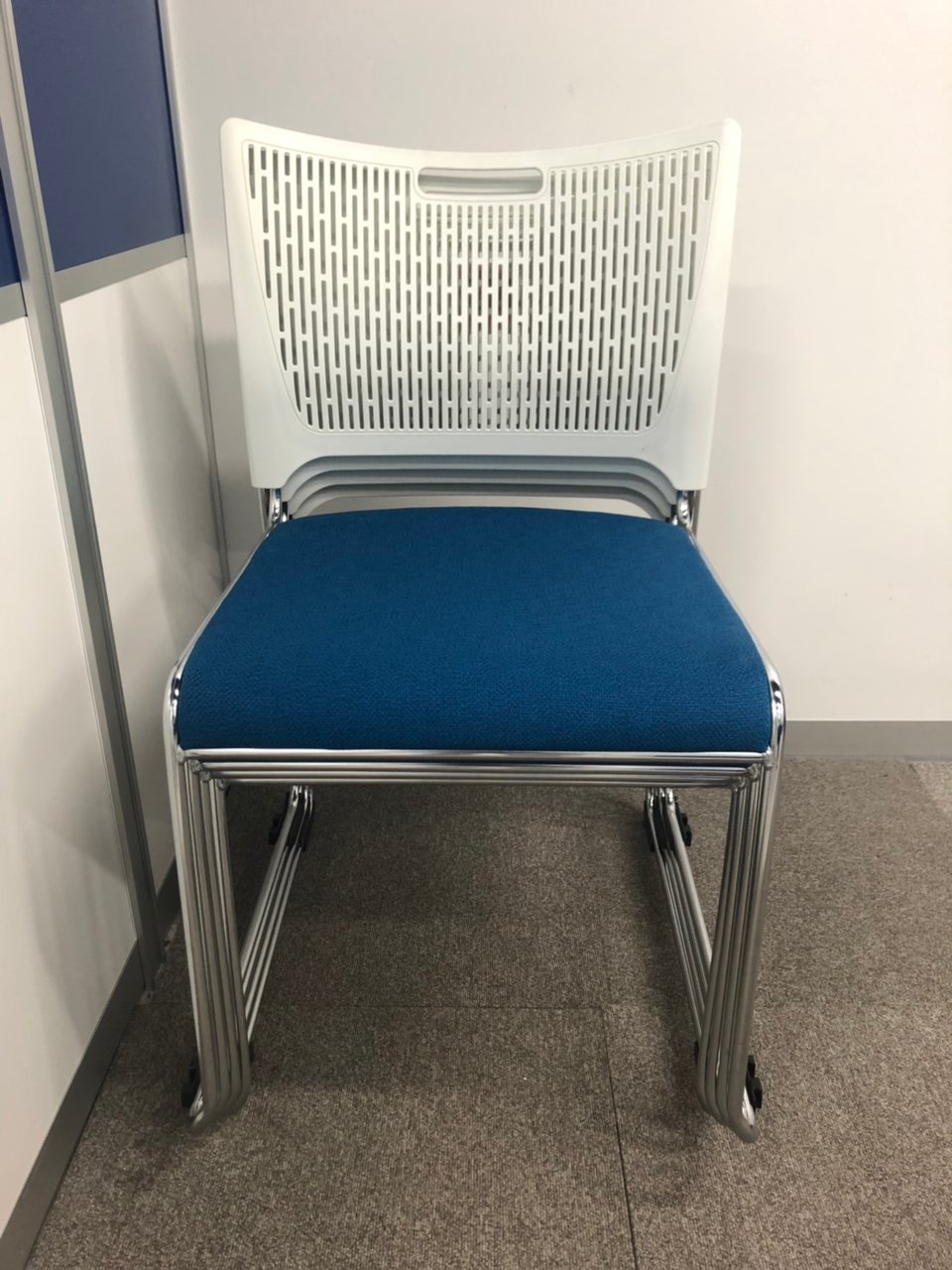 【重ねて収納可能!さわやかなカラーとシンプルデザイン!】■オカムラ製 レーテ スタッキングチェア ミーティングチェア ■キャスター付き ■座面ブルー×背面ホワイト【2412】弊社使用欄【A00990049】
