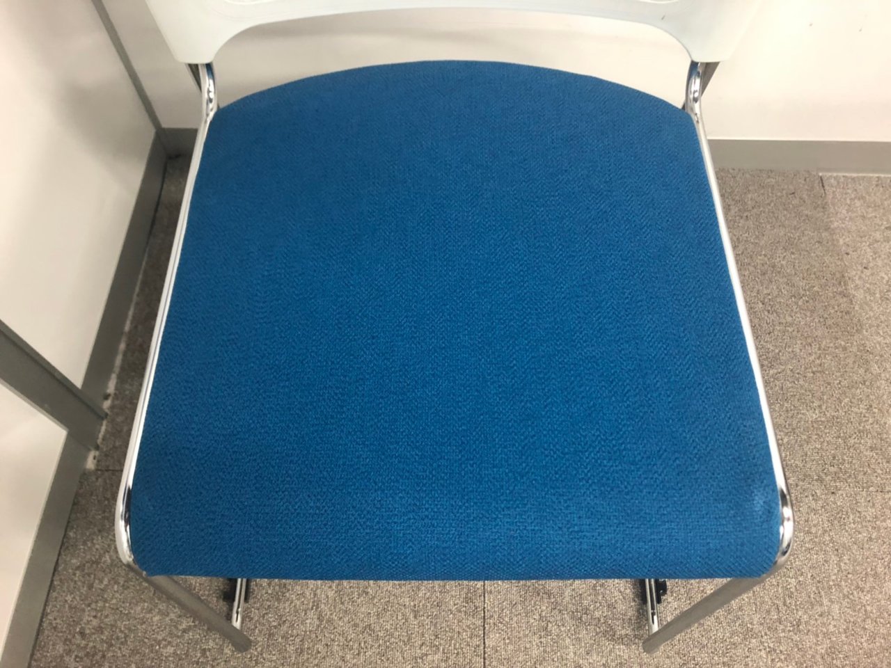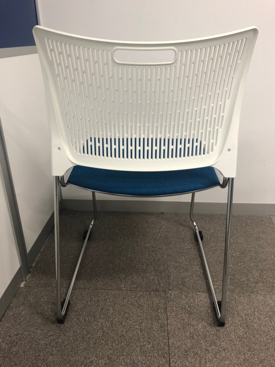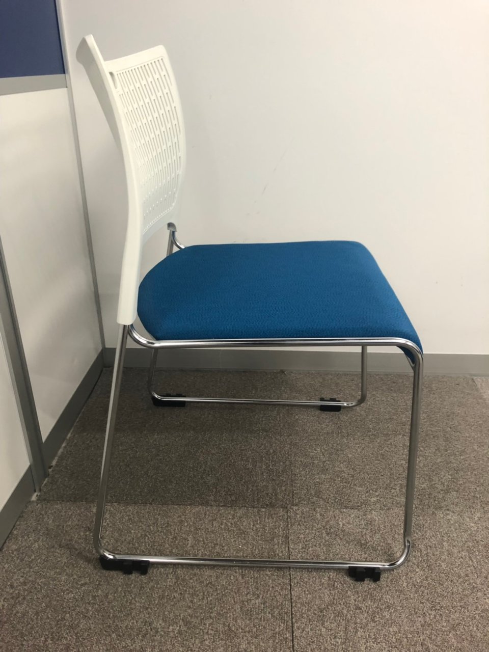 【重ねて収納可能!さわやかなカラーとシンプルデザイン!】■オカムラ製 レーテ スタッキングチェア ミーティングチェア ■キャスター付き ■座面ブルー×背面ホワイト【2412】弊社使用欄【A00990049】