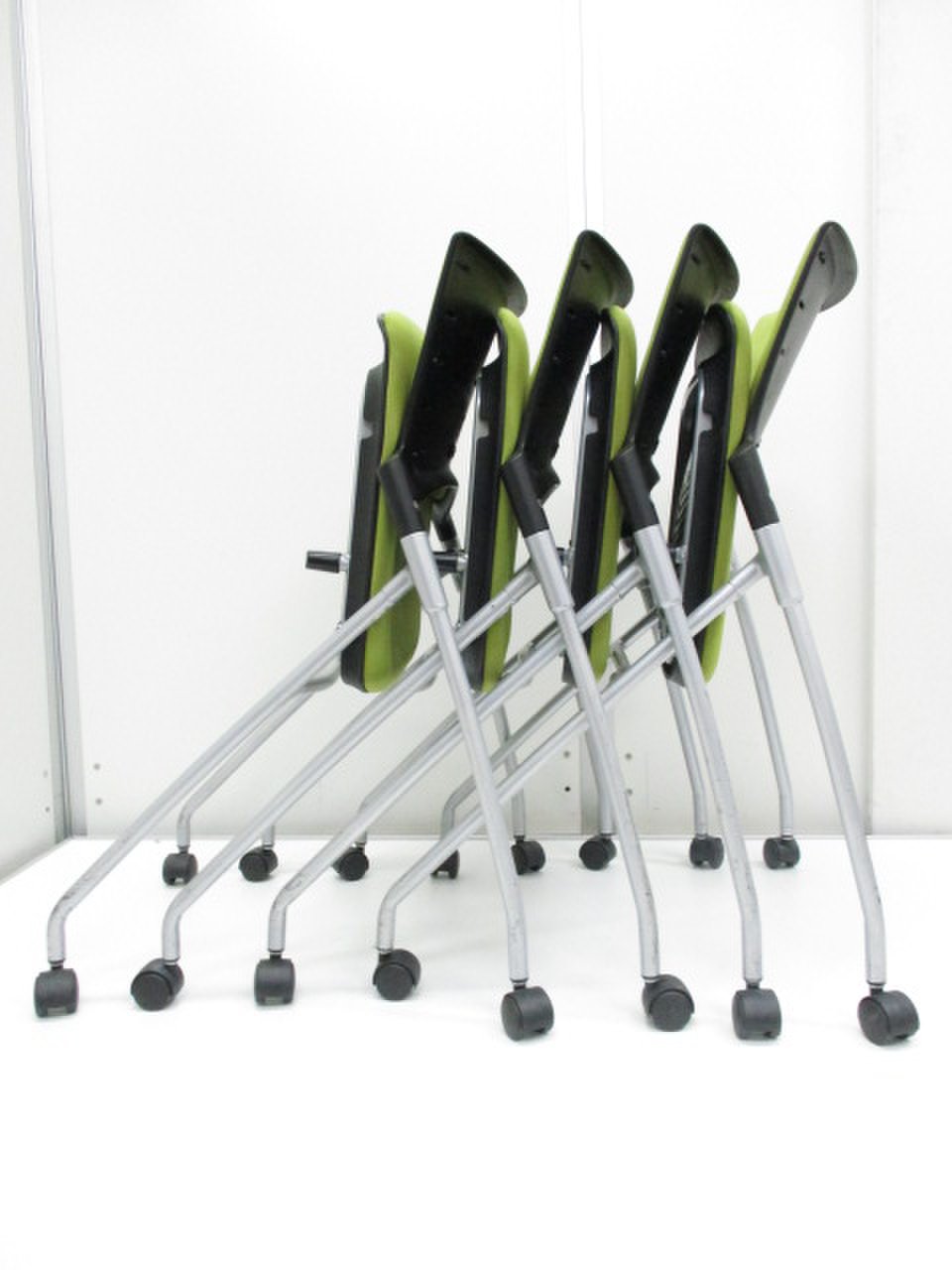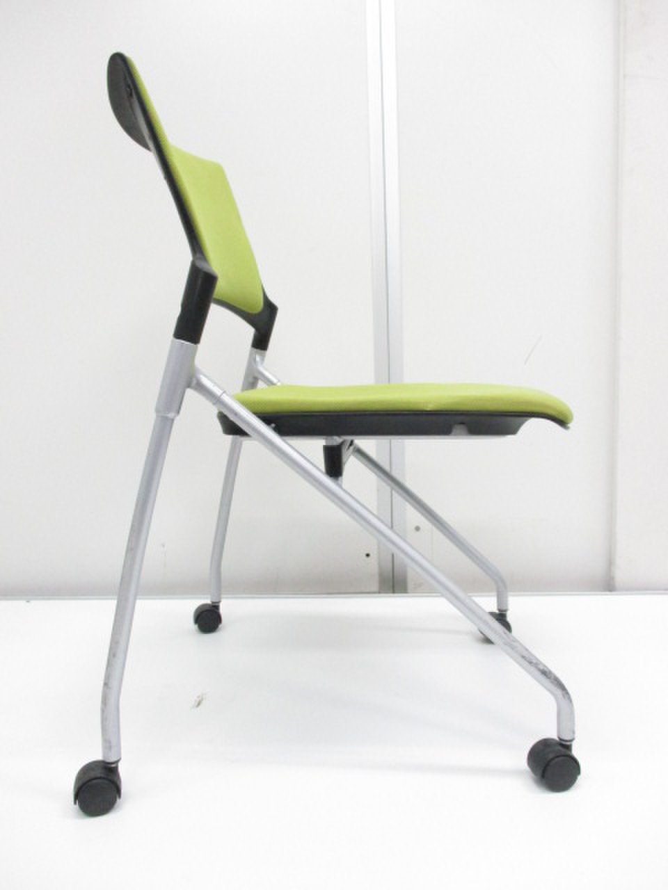 カラーはグリーン色で収納時は、座面をあげてスーパーの買い物カートのようなイメージで収納可能となっております!