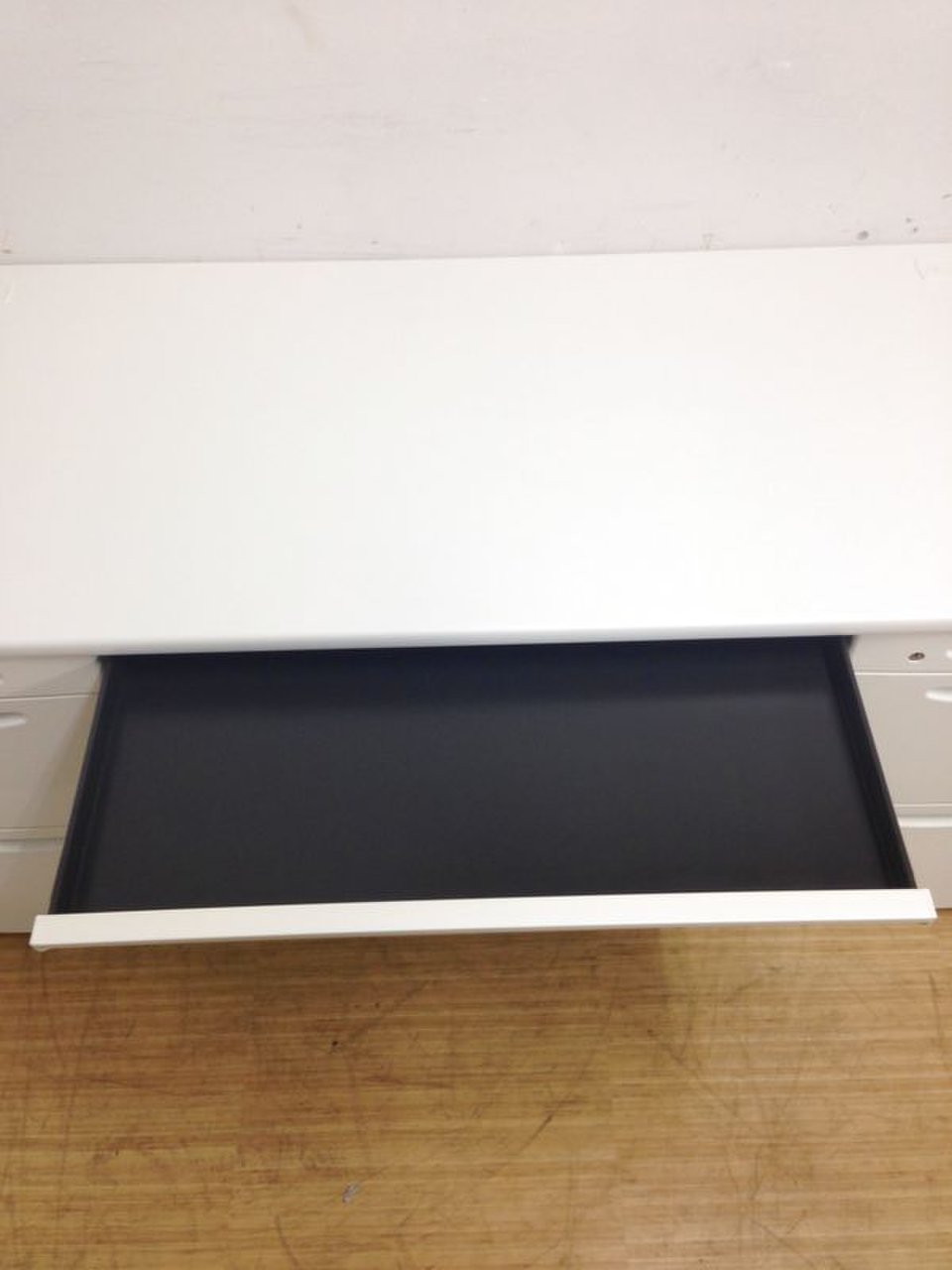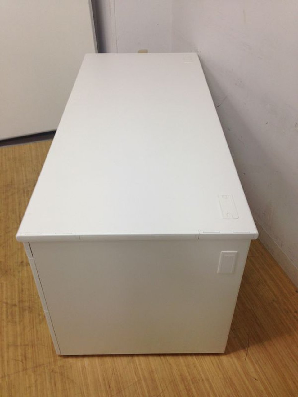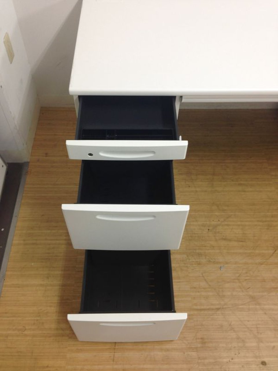 - 袖机のワゴンは、最下段がロング引出しになっており、従来より収納力120%アップ。