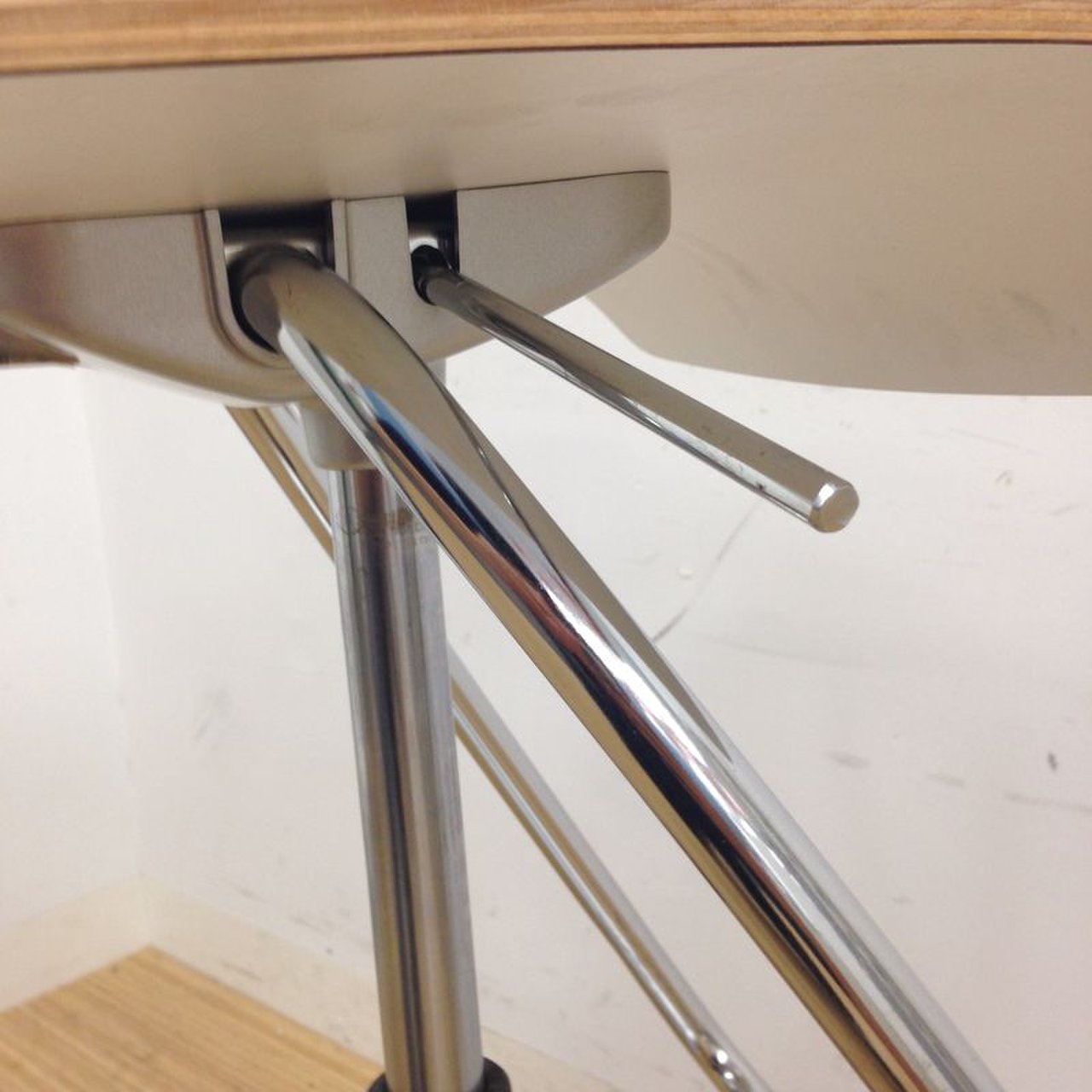 - かなり強い濃い黄ばみ・変色が商品全体にある。(例、座面・背もたれ、脚部等にある。)