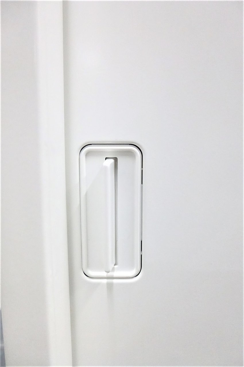 2枚引き戸書庫 オカムラ レクトライン 鍵付き シリンダー錠 ホワイト 天板無し スライド式の扉のため導線を邪魔しません