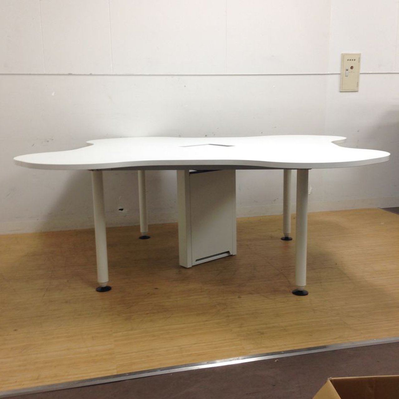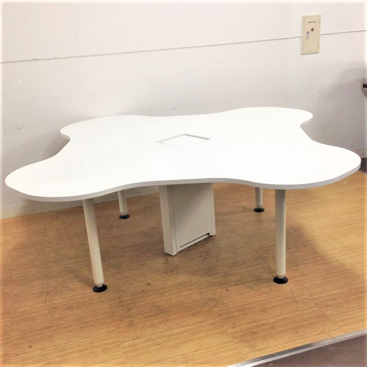 - 一部不具合あり天板歪み、アジャスター無し、キャスター使用不可ようなそのテーブルの本来の効用を果たすための機能以外の一部が使用不可な状態。(例、キャスターロッ ク機能使用不可、棚板無し等がある。)