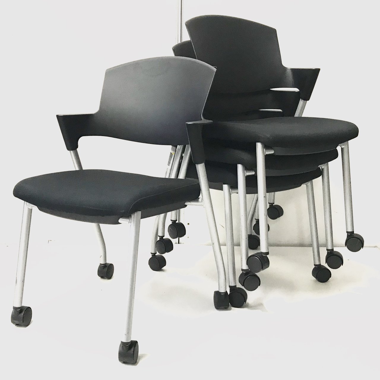 【6/16・8脚入荷予定!】【シンプルスマートなスタッキングチェア!分厚いクッションで長時間でも快適な座り心地!】■コクヨ製 プロッティ スタッキングチェア 肘付ミーティングチェア ■固定肘 ■キャスター付 ■ブラック ■背面樹脂 オフィスバスターズ梅田本店