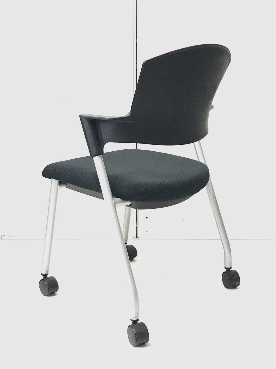 【シンプルスマートなスタッキングチェア!分厚いクッションで長時間でも快適な座り心地!】■コクヨ(KOKUYO)製 プロッティシリーズ スタッキングチェア 肘付ミーティングチェア ■固定肘 ■キャスター付 ■ブラック ■背面樹脂 【弊社使用欄:A01006552】