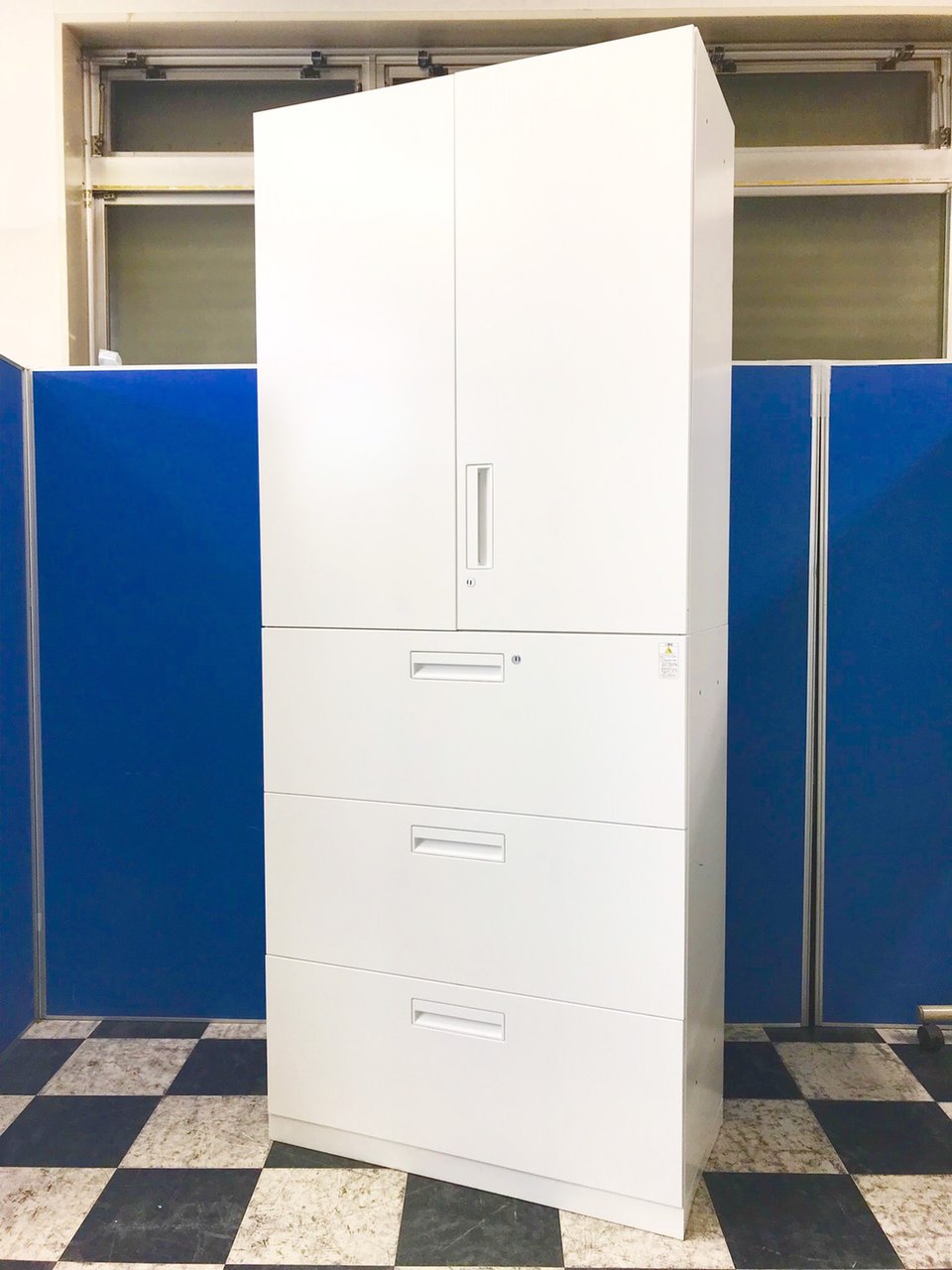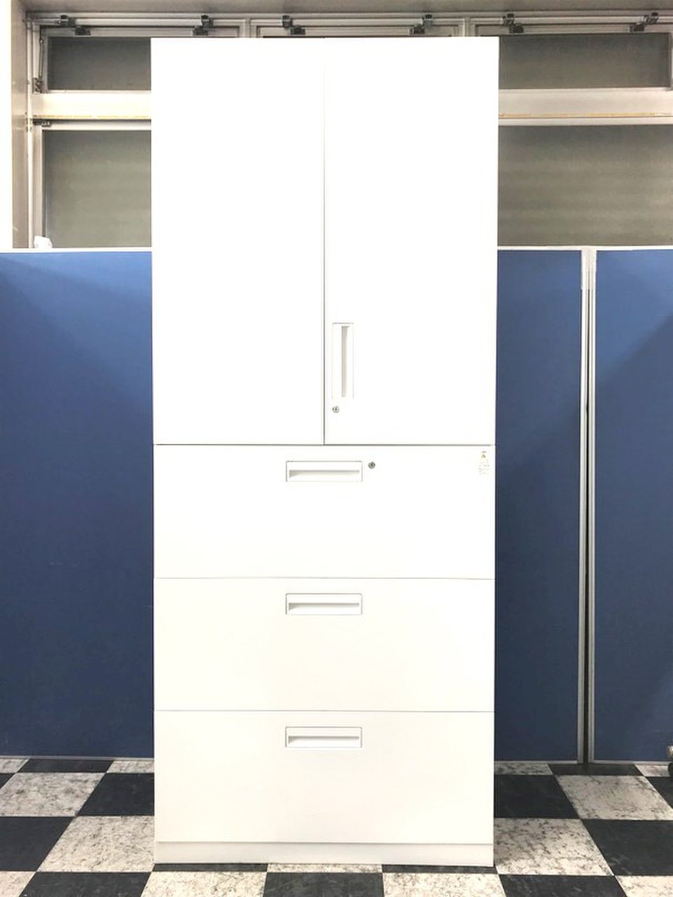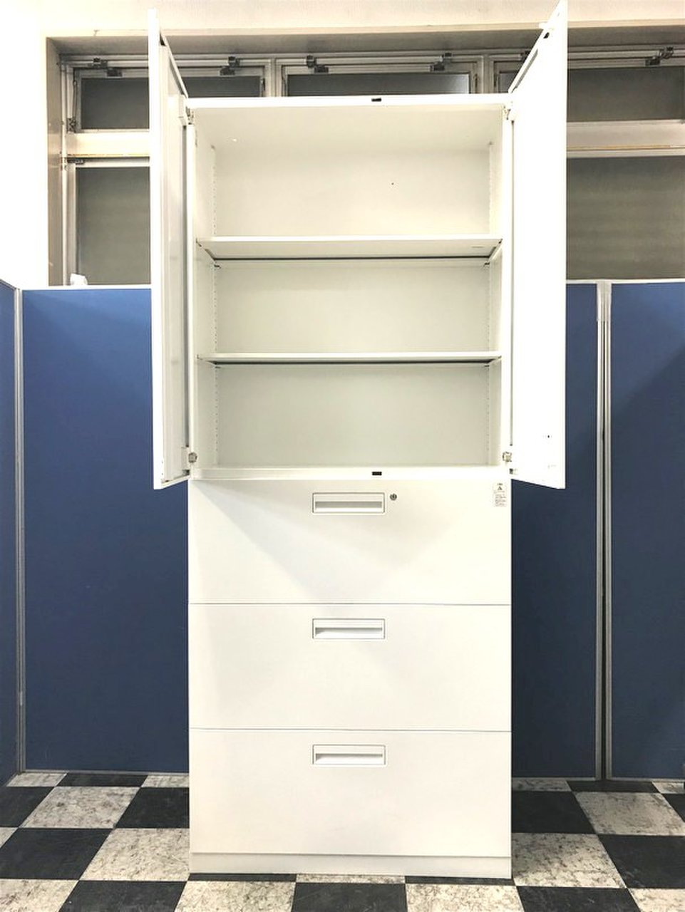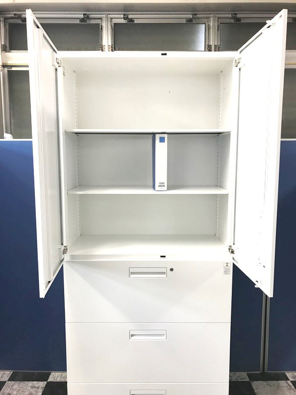【限定1台】きれいなホワイト書庫セット!コクヨ製エディア!観音開き(両開き)+3段ラテラル A4ファイル6段分収納可能で大容量!- 埼玉本店