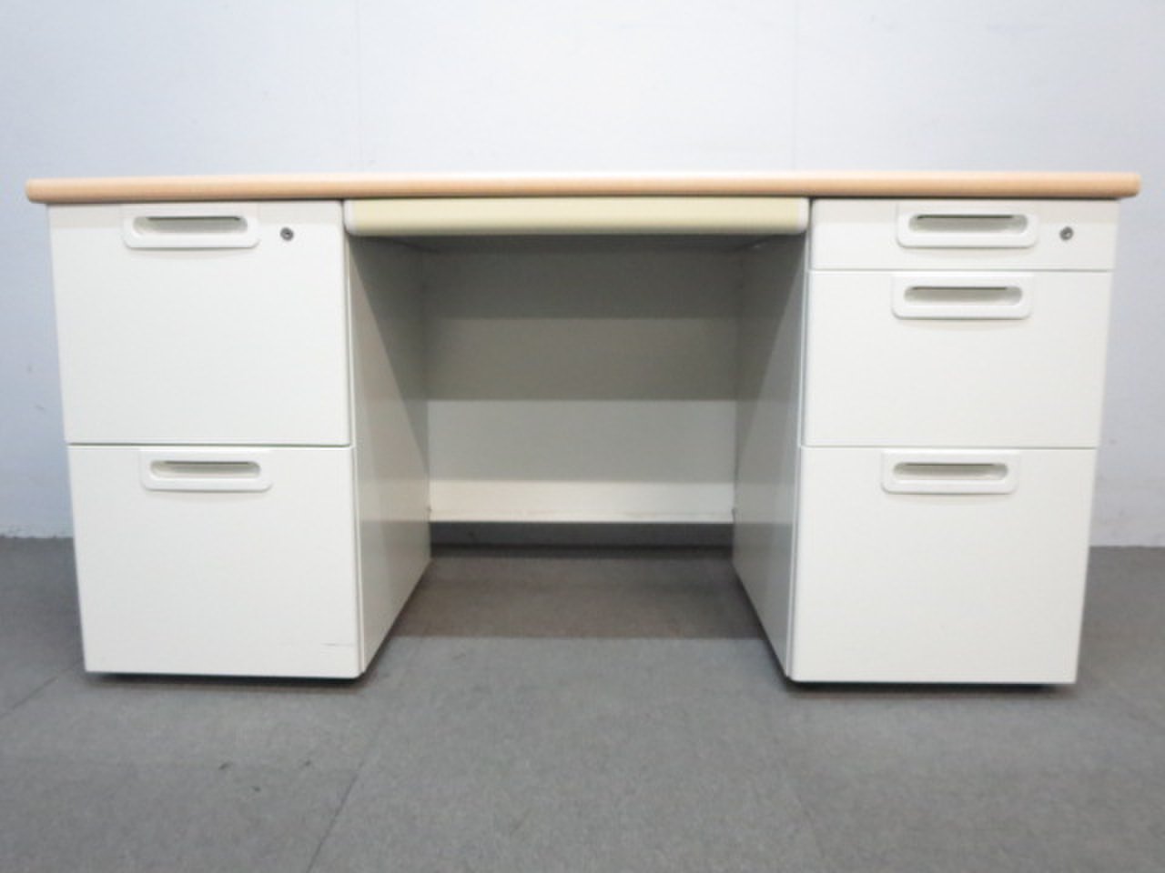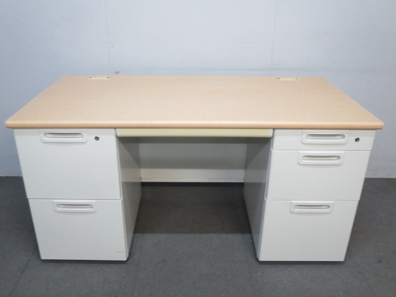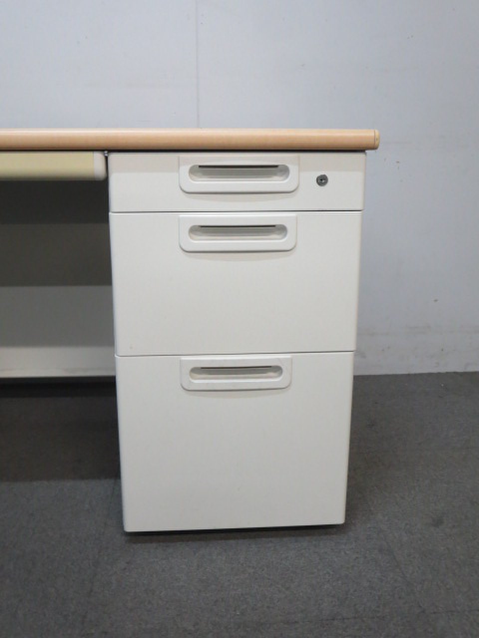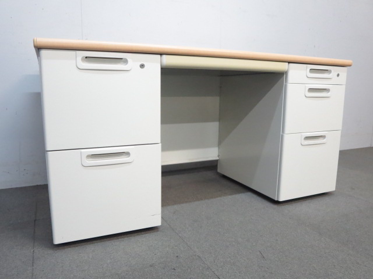天板はナチュラルカラーの木目柄、袖引出しはホワイトカラーで、