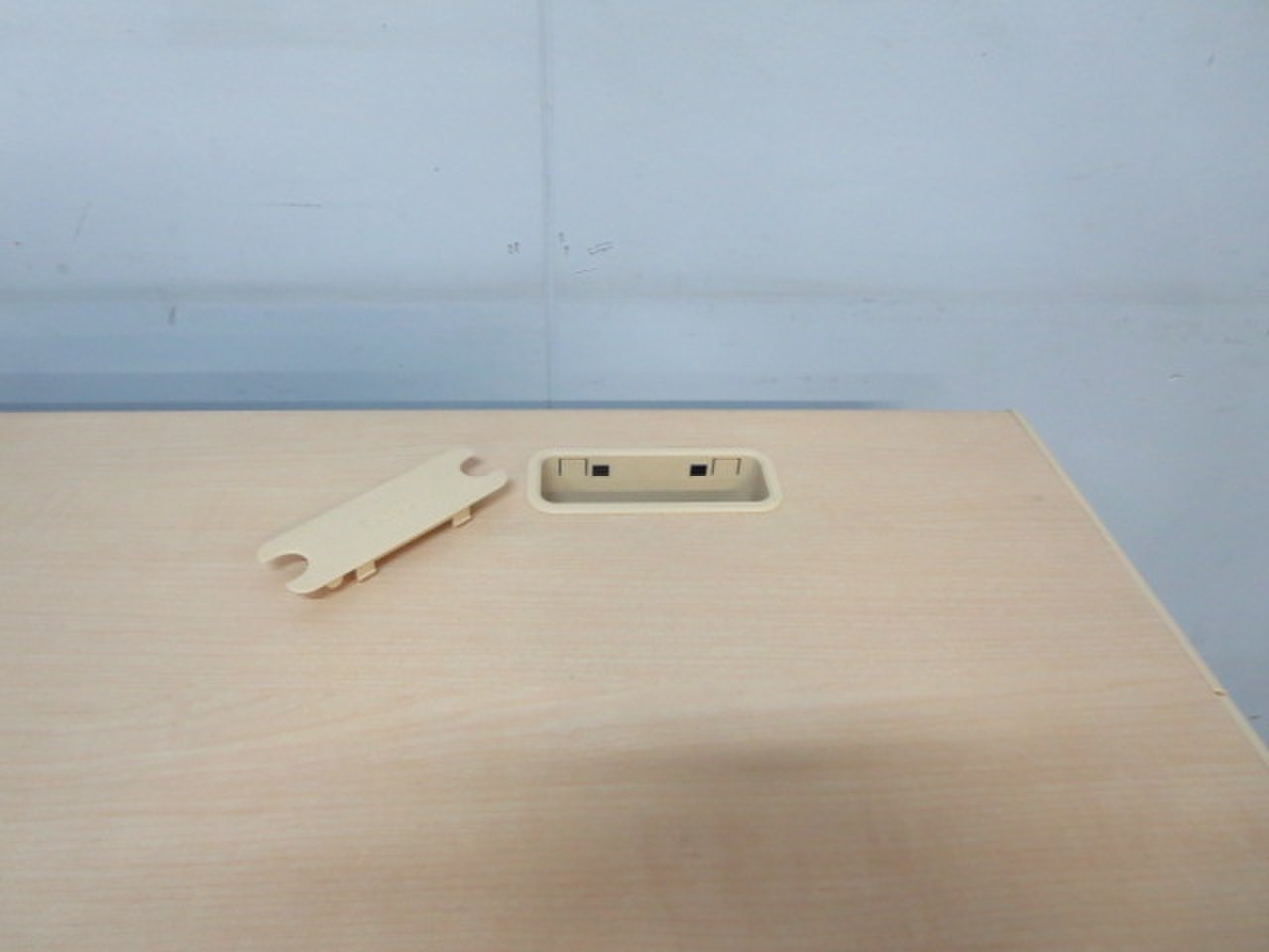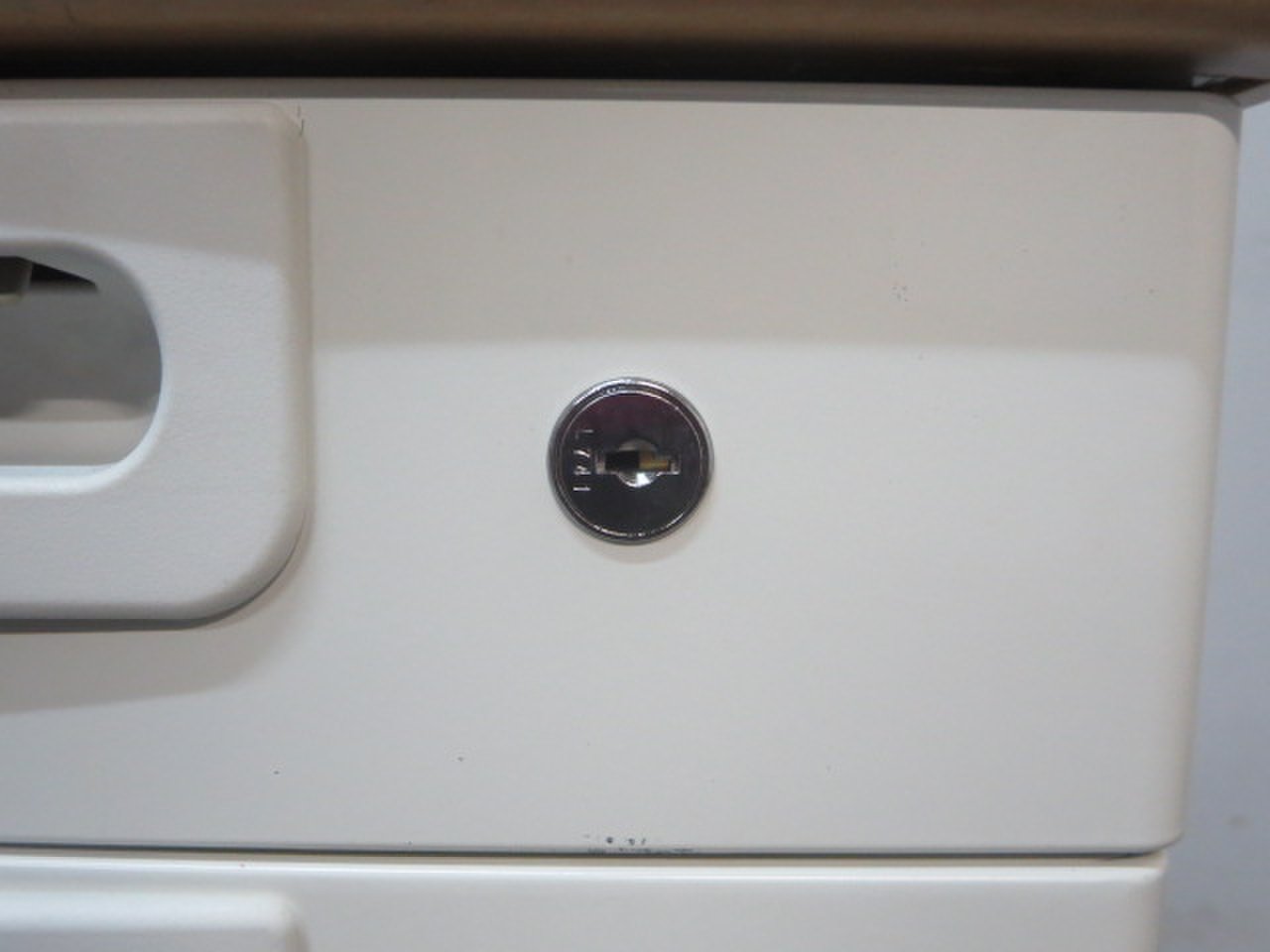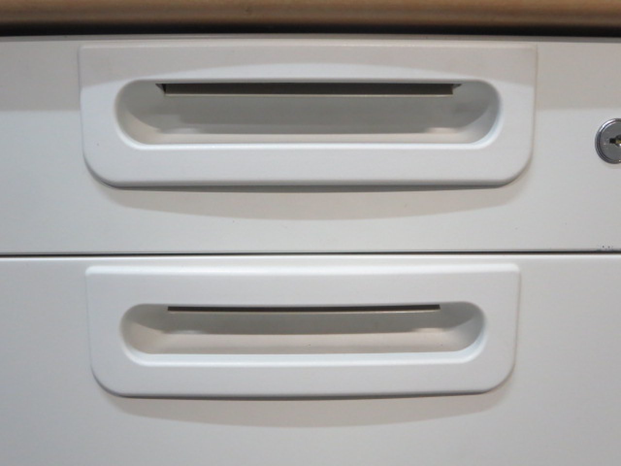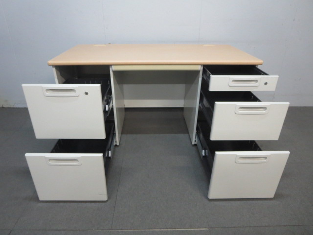 天板はナチュラルカラーの木目柄、袖引出しはホワイトカラーで、