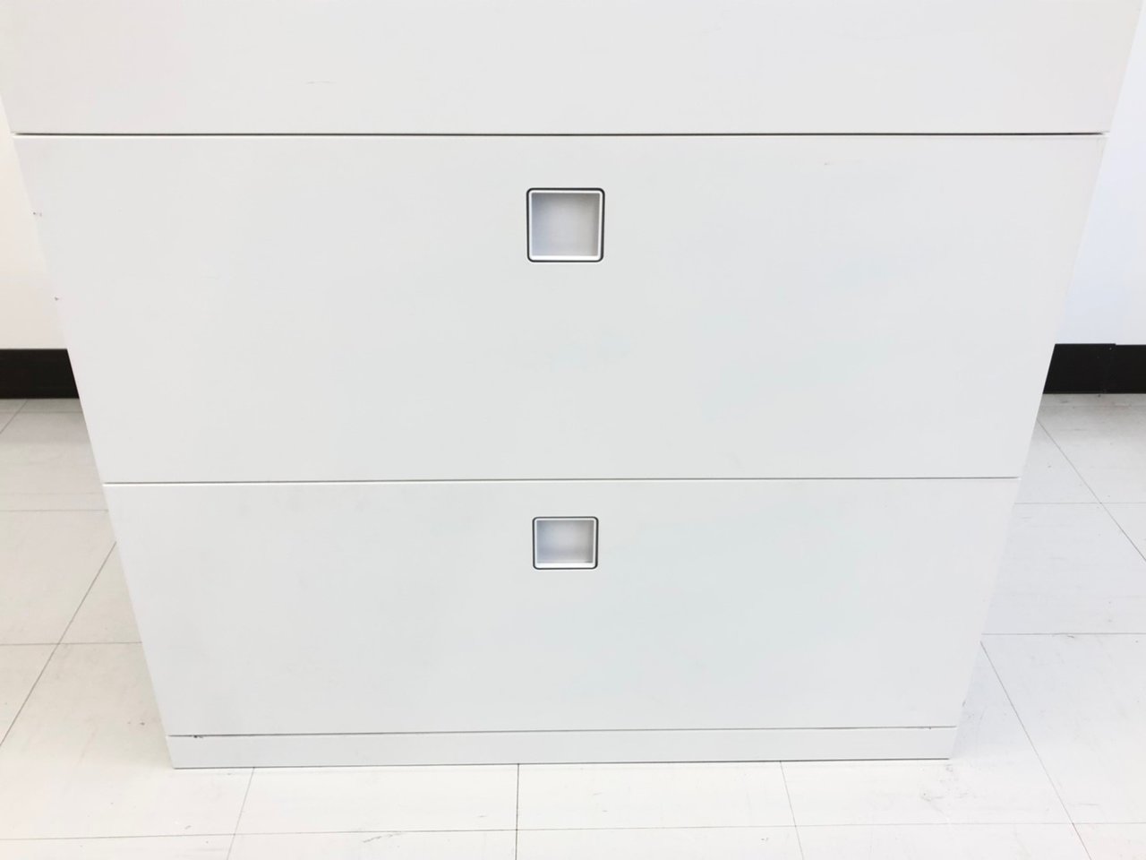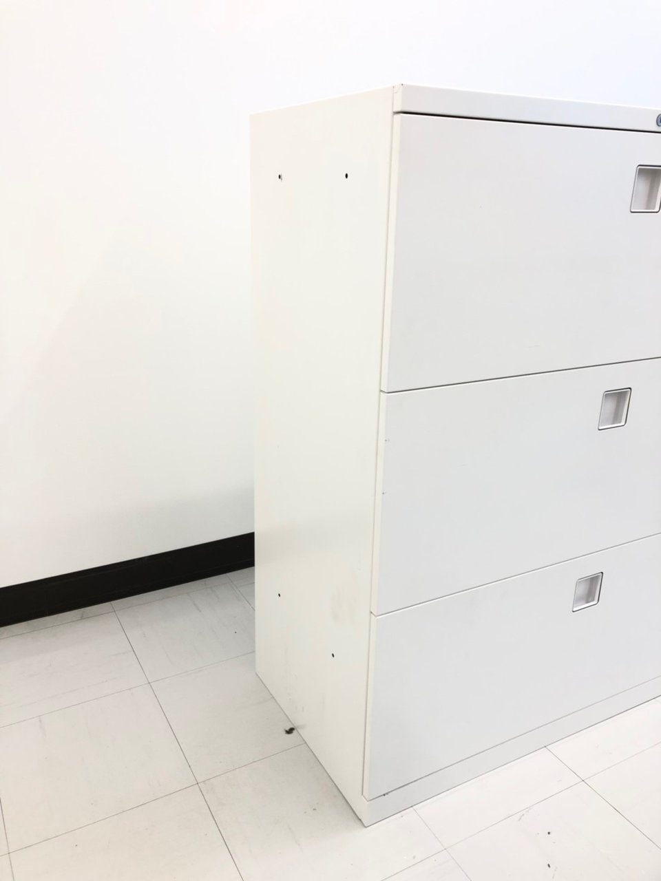 オカムラ レクトライン 3段ラテラル書庫 ホワイト天板 シリンダー錠 鍵付き ※取っ手部分に若干日焼けあり