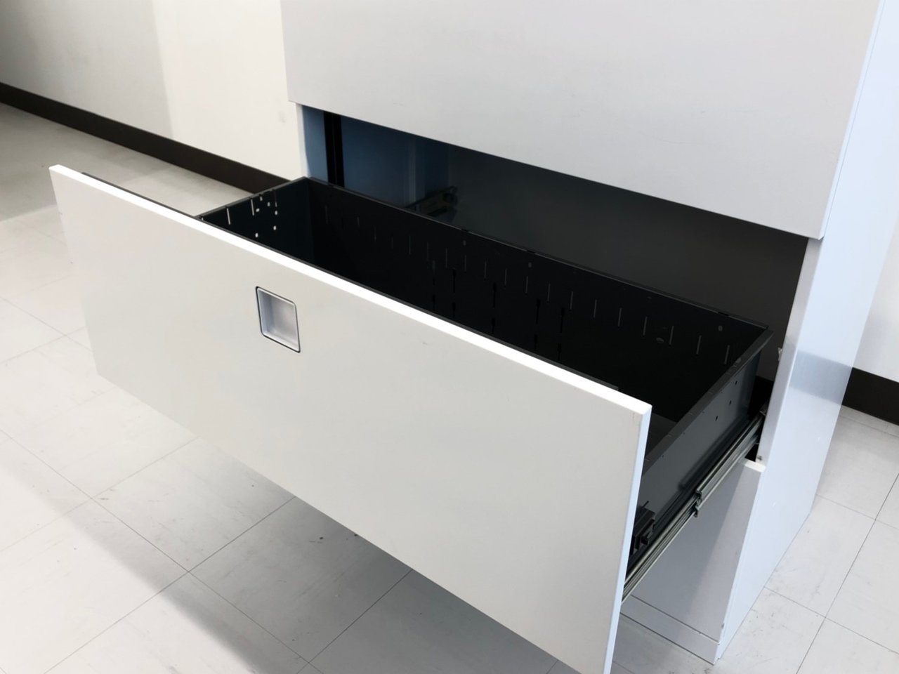 【使いやすさで選ぶならコレ!大容量の三段キャビネット】■オカムラ(Okamura)製 レクトラインシリーズ(Rectline) 3段ラテラル書庫 ローキャビネット ■天板付き ■シリンダー錠 ■ホワイト