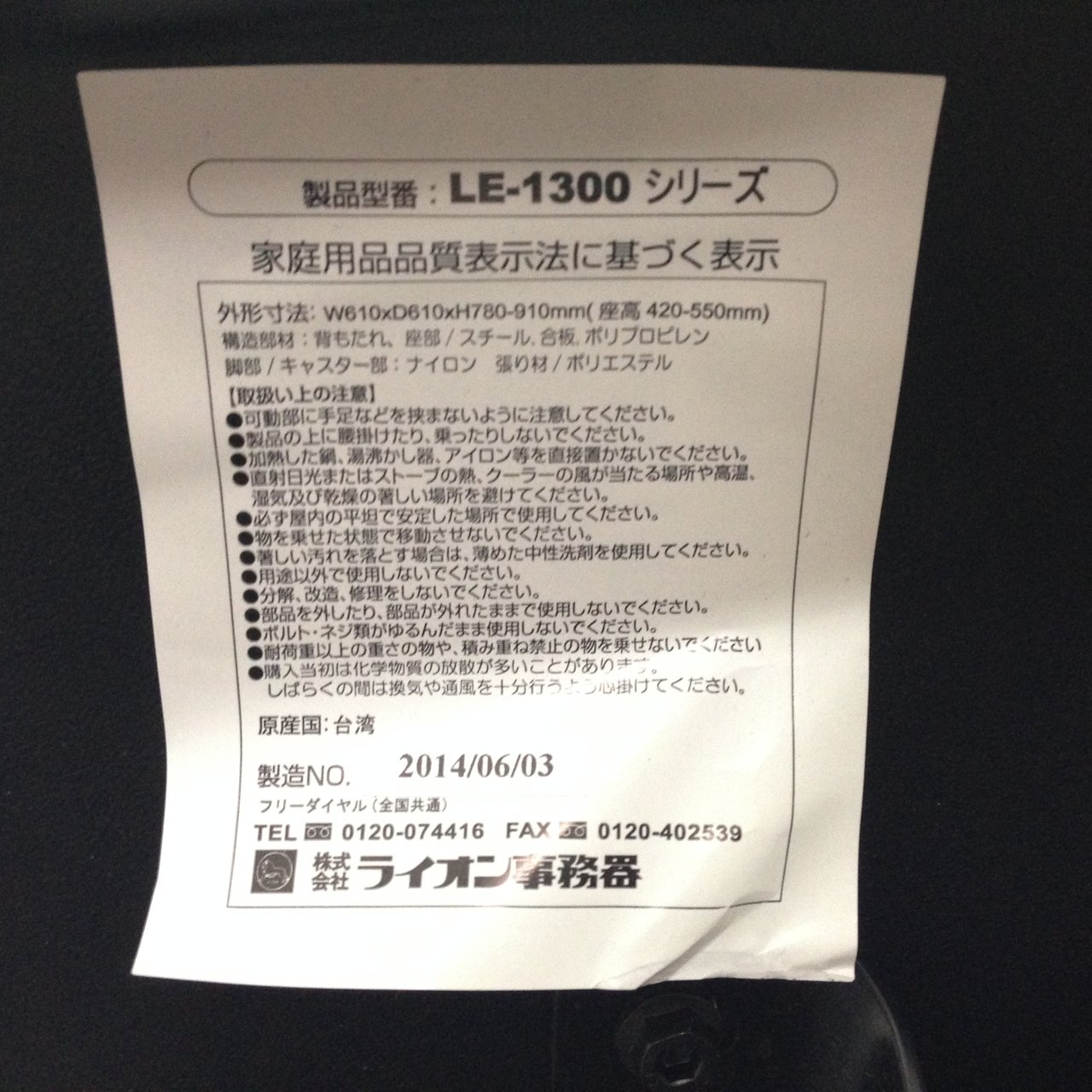 【中古】 LE-1300 ライオン 肘無ローバックチェア 260455