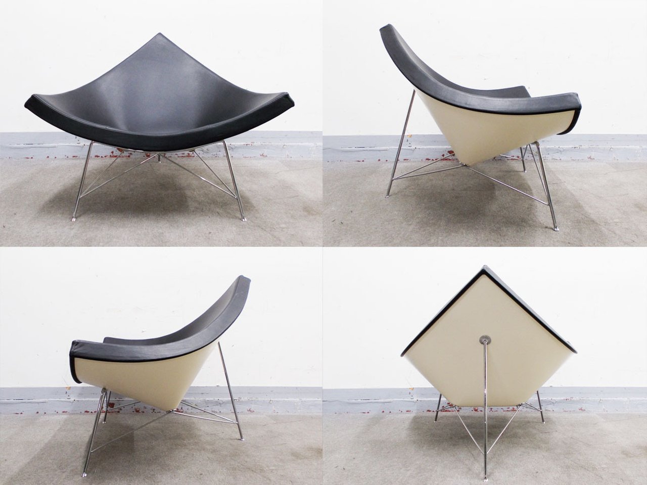 ジョージ・ネルソン(George Nelson)デザインのココナッツチェアは、その名のとおり、ココナッツの殻が割れたような形をしています。ブラックの張り地は使い込めばアジがでる1枚の本革仕様です。 名前からは想像できないその存在感は圧巻です。思わず「座ってみたい」と思わせるこのユニークなフォルムは、ショップのディスプレイとしても最適です。
