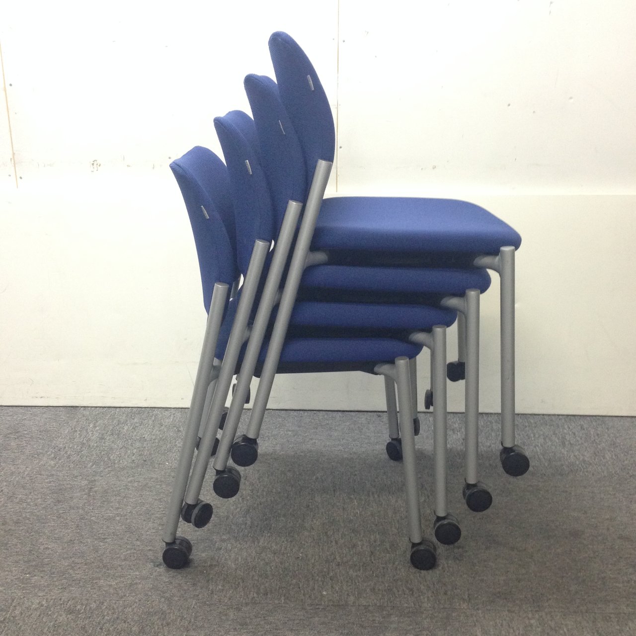 【12脚揃います】オカムラ製、スタッキングチェア!開業や移転のお客様にオススメ致します!人気のブルー・キャスター付きなので移動も楽・重ねて収納もできる!【コスパ商品】- 豊中・尼崎店