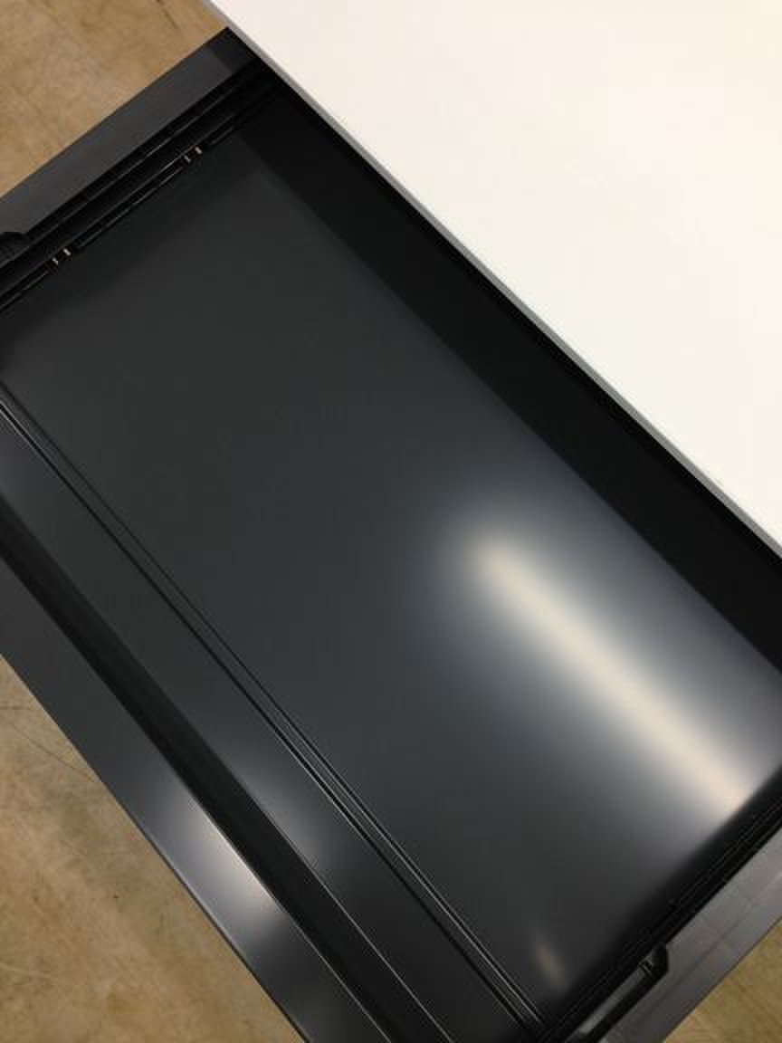 - 地震時、センター引出しが飛び出さないよう、ラッチ機構を装備。脚はデスクの横ズレを軽減させる設計になっています。