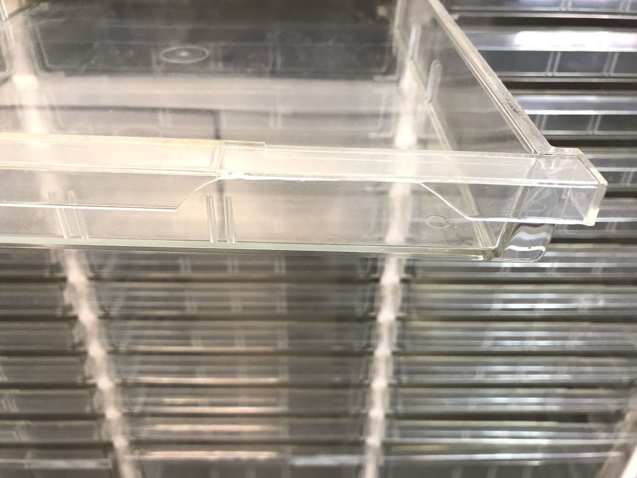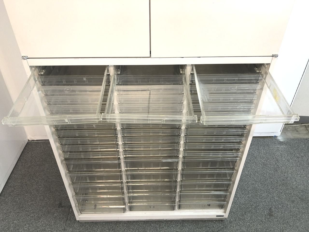 カタログなどの書類を用途別に分けたり様々な使用が可能なクリスタルトレイキャビネット。