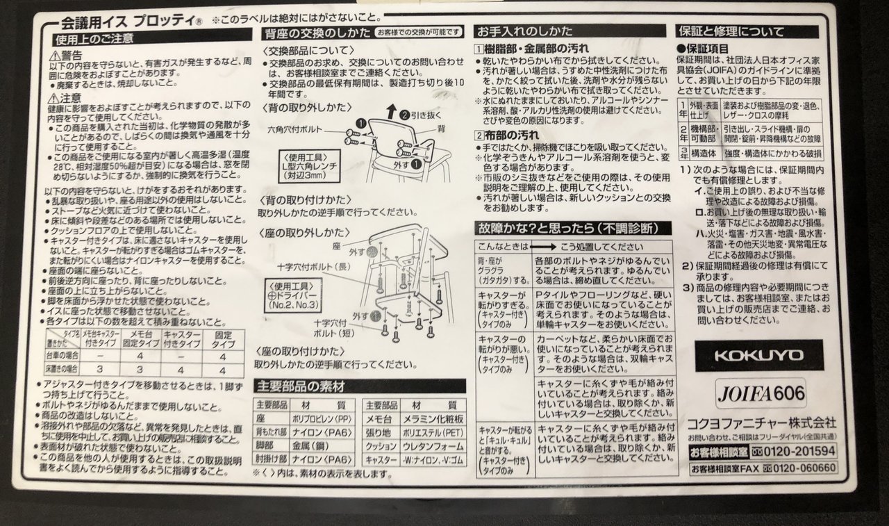 - 不具合多数そのチェアの本来の効用を果たすための機能に不具合ある。(例、オフィスチェアの上下昇降キャスター付きミーティングチェアのキャスター使用不可のような不 具合)