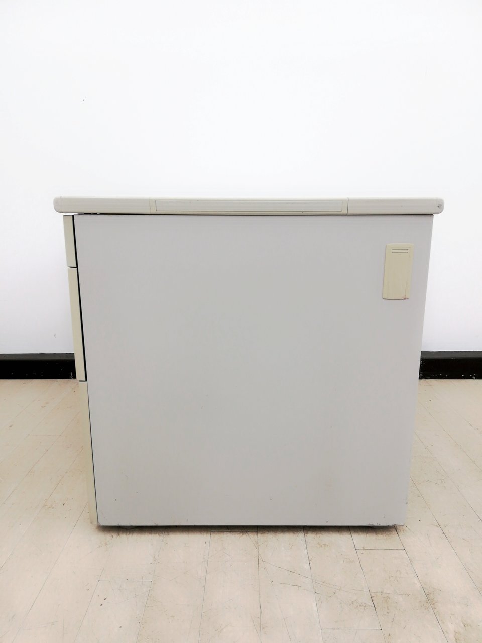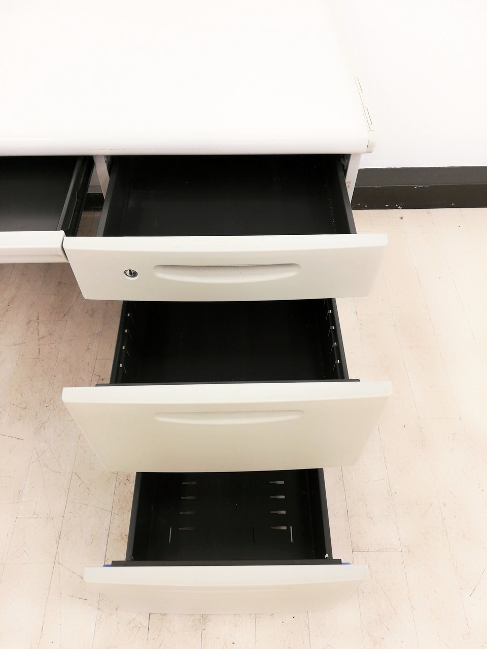 - 袖机のワゴンは、最下段がロング引出しになっており、従来より収納力120%アップ。