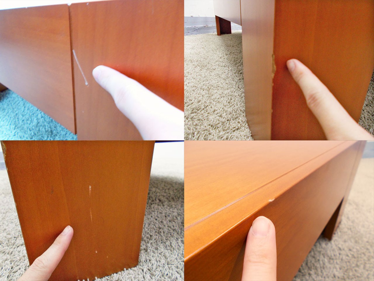 - 目立つ箇所複数あり深い傷・凹みが商品全体にある。(例、天板、幕板、棚板、サイド部分、脚部等にある。)