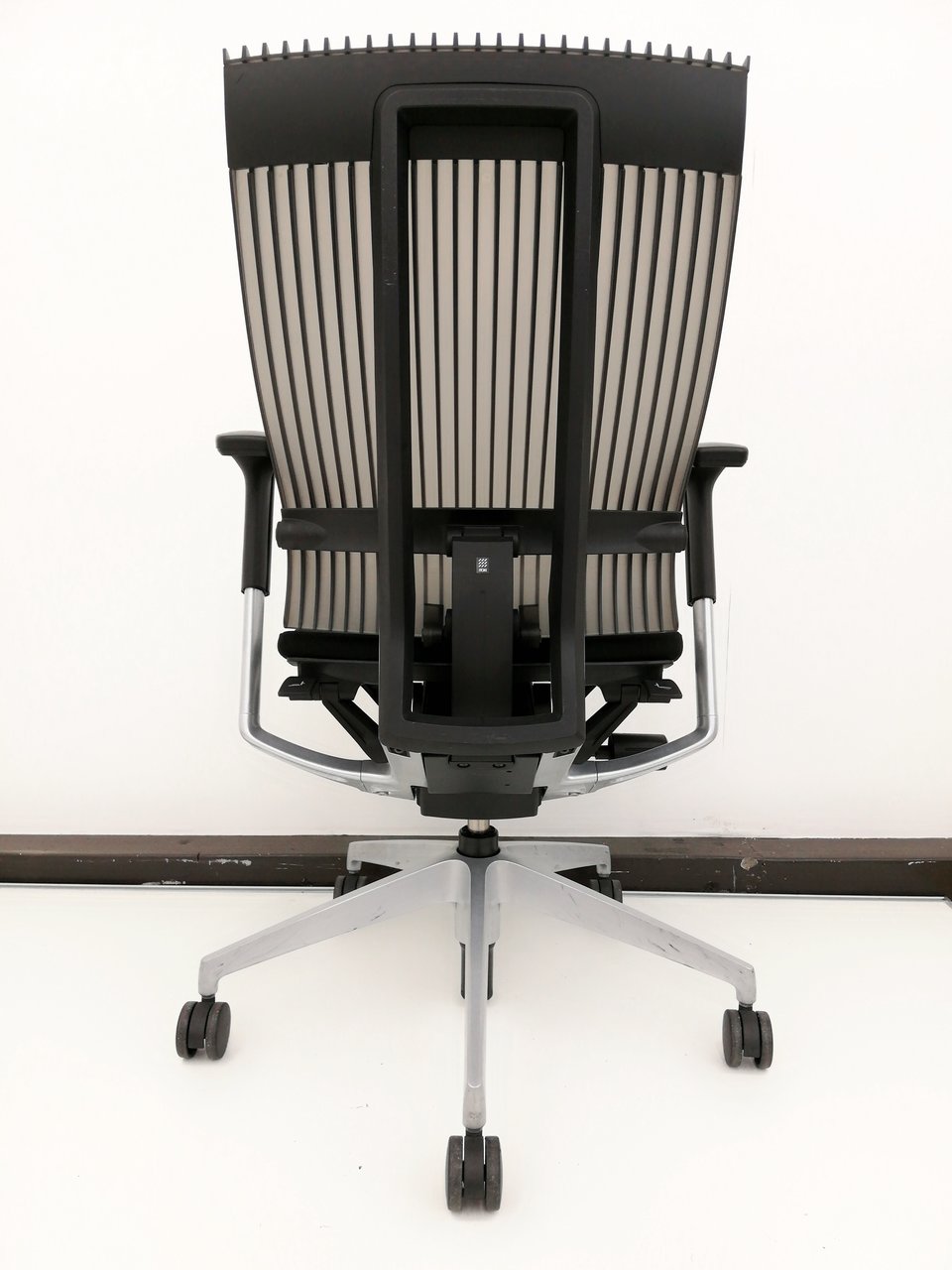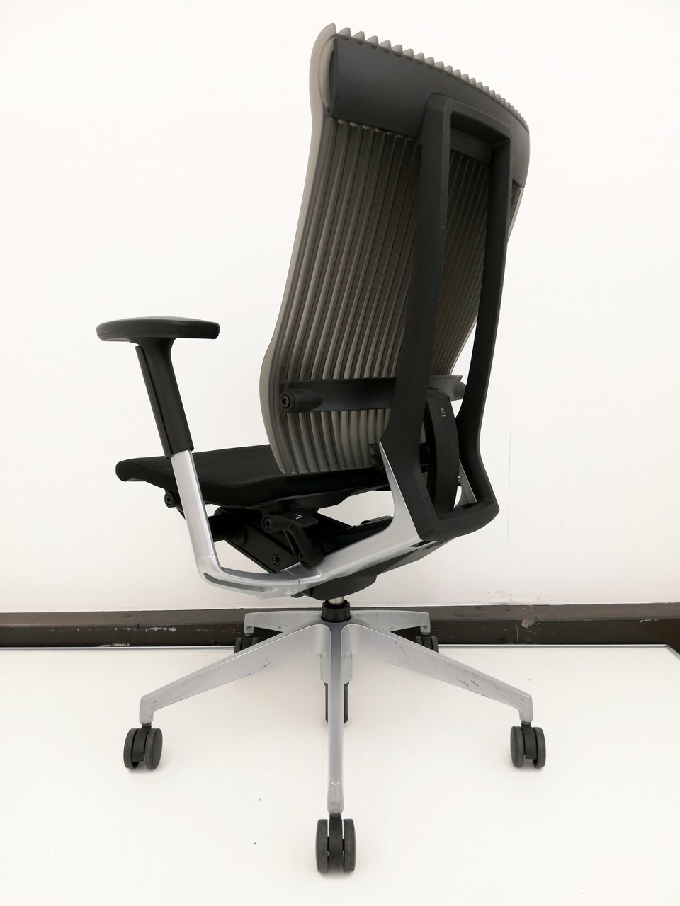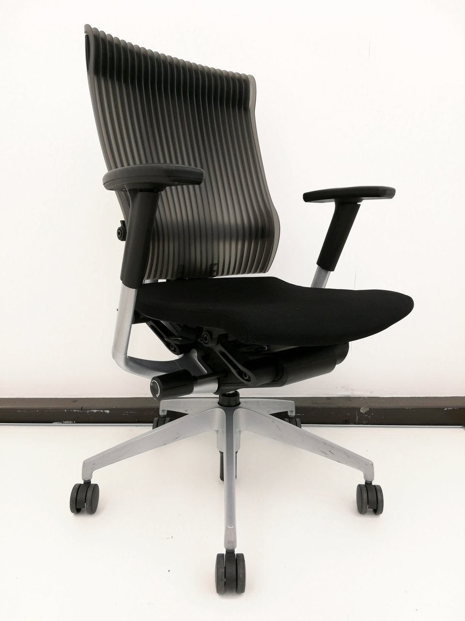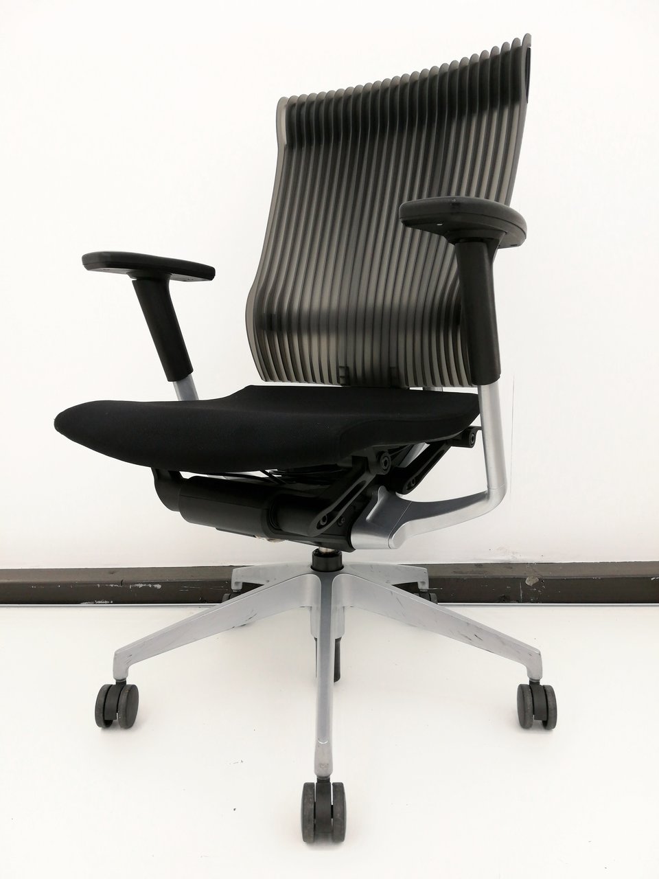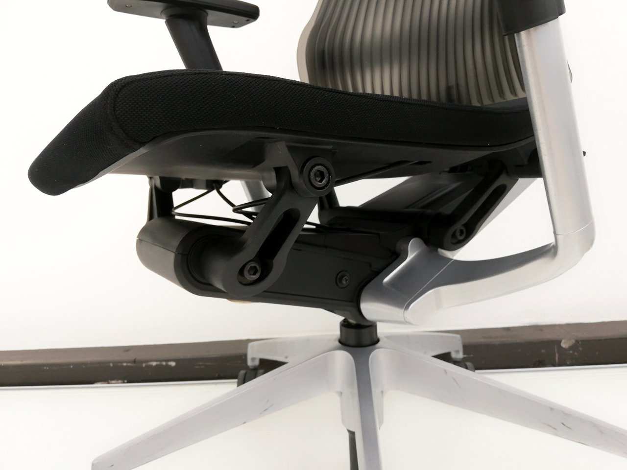 また、背もたれはクッションやメッシュでもなく、「エストラマー樹脂」という、弾力のある樹脂を成形してつくられているんです!!!一見堅そうに見えるのですが、「ひだ」のような形をしていて、面ではなく点で支えるような設計になっていまして、通気性も良いは見た目もカッコいいは良いとこ取りなんですねこれが。