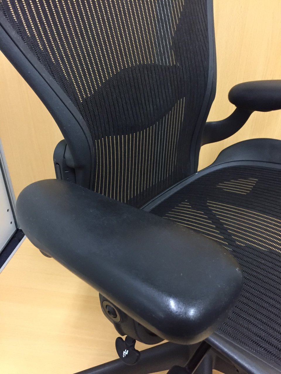 【★肘と脚にスレあり!見た目を気にしなければ使用に問題なし★】ハーマンミラー製 アーロンチェア(スタンダードタイプ) メッシュ 在宅 自宅 ゲーム 海外製 椅子 リラックス 中古家具 中古オフィス 九州最大級《オフィスバスターズ福岡博多店は、福岡を拠点として、日本全国へ中古オフィス用品・オフィス家具を提供しております》