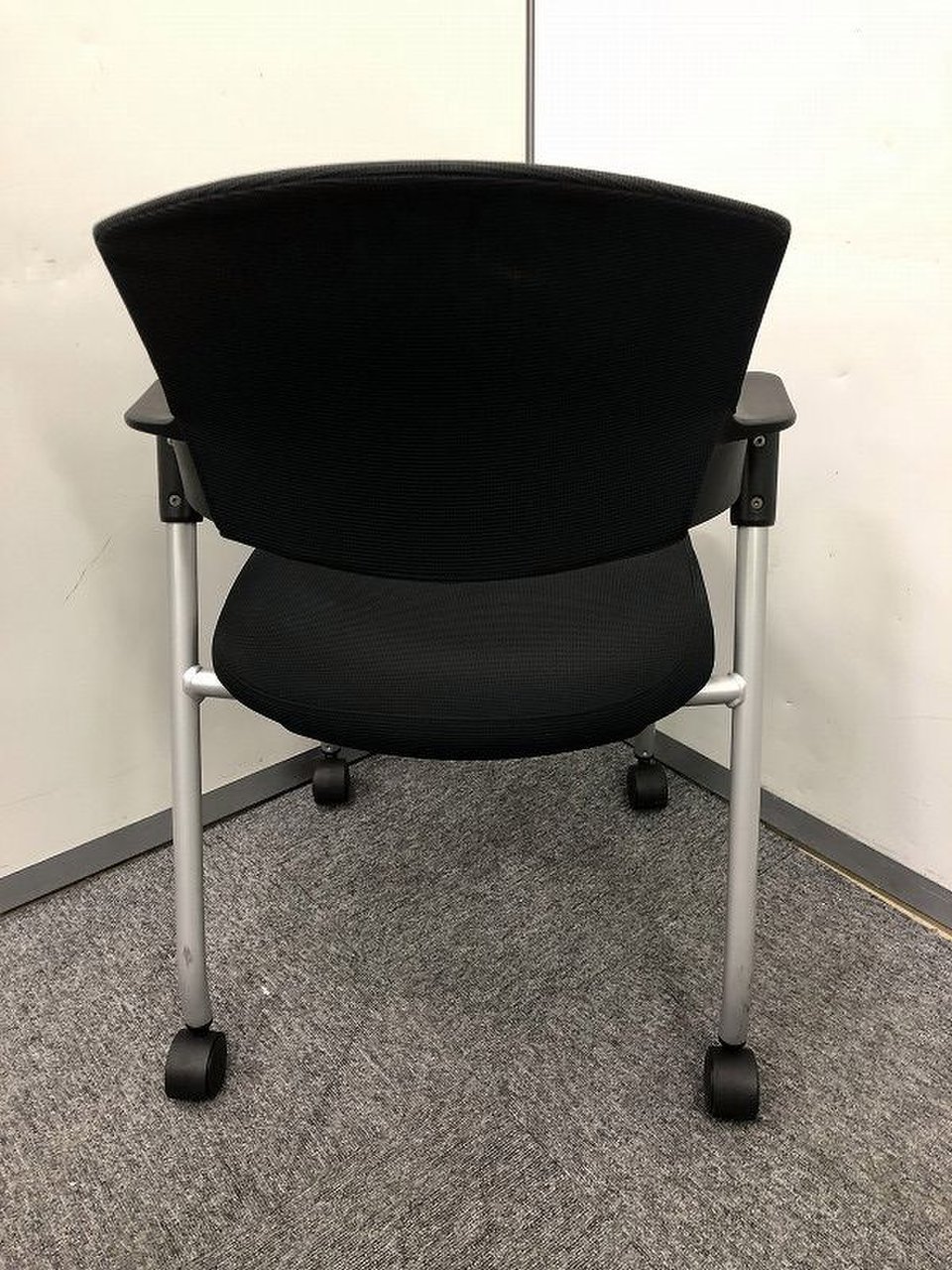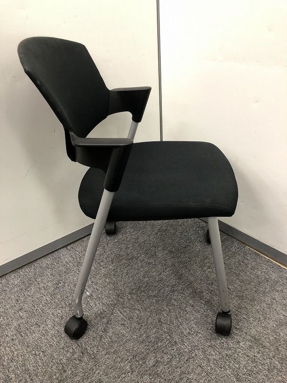 【シンプルスマートなスタッキングチェア!分厚いクッションで長時間でも快適な座り心地!】■スタッキングチェア 肘付ミーティングチェア ■固定肘 ■キャスター付 ■ブラック ■背面樹脂/コクヨ(KOKUYO/プロッティ
