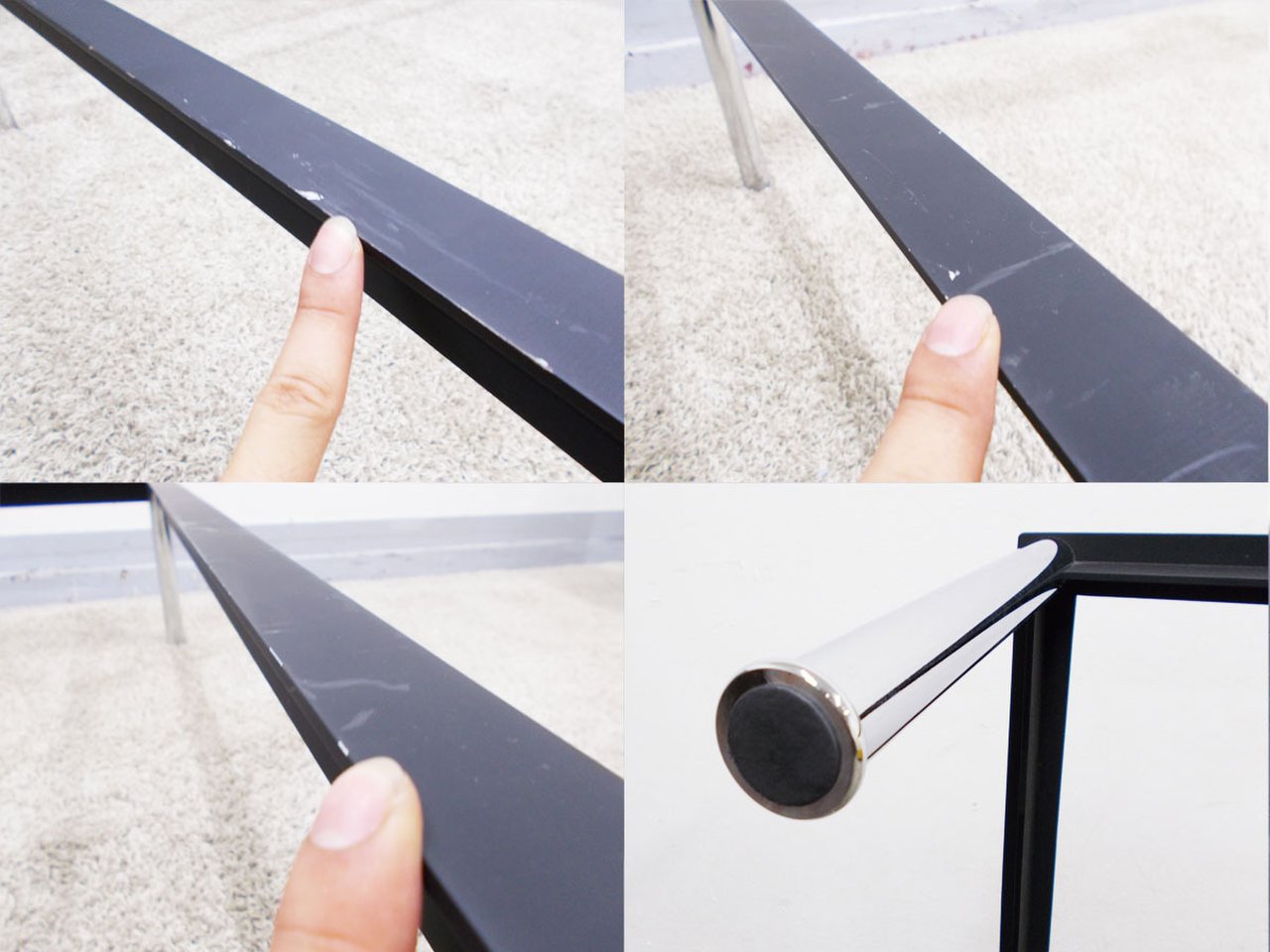 - 目立つ箇所あり傷・凹みが多数、深い傷・凹みが一部ある。(例、天板、幕板、棚板、サイド部分、脚部等にある。)