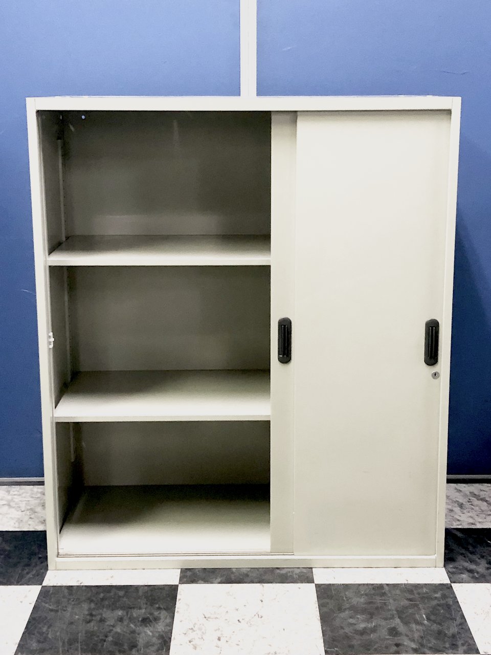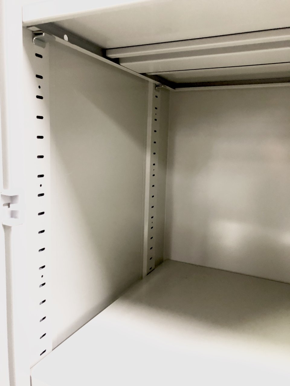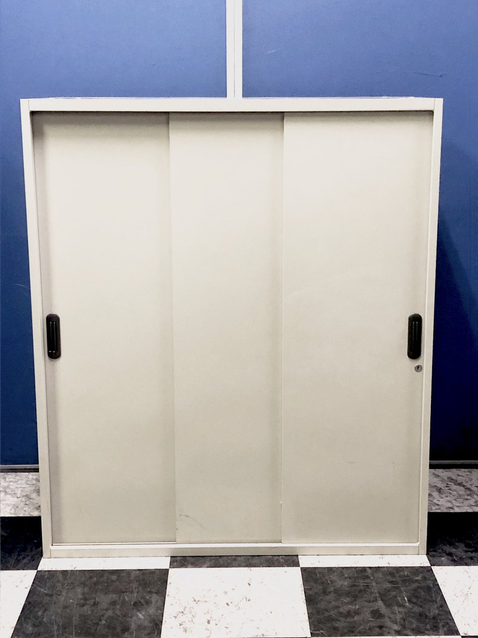 スチール引き違い書庫のメリットは、扉を開ける際に書庫以上に余分なスペースを取らない点で、取り出しが出来る点です。