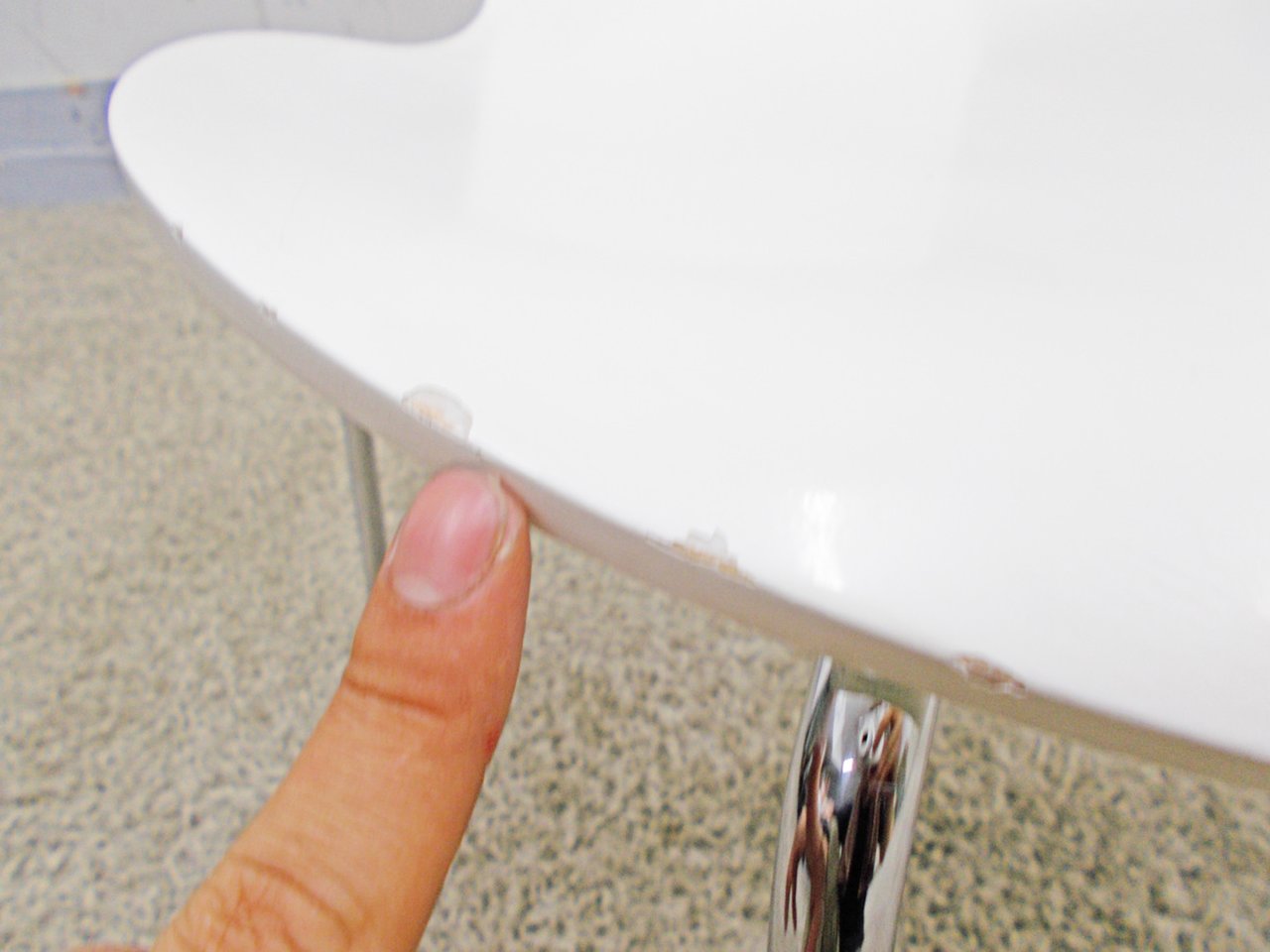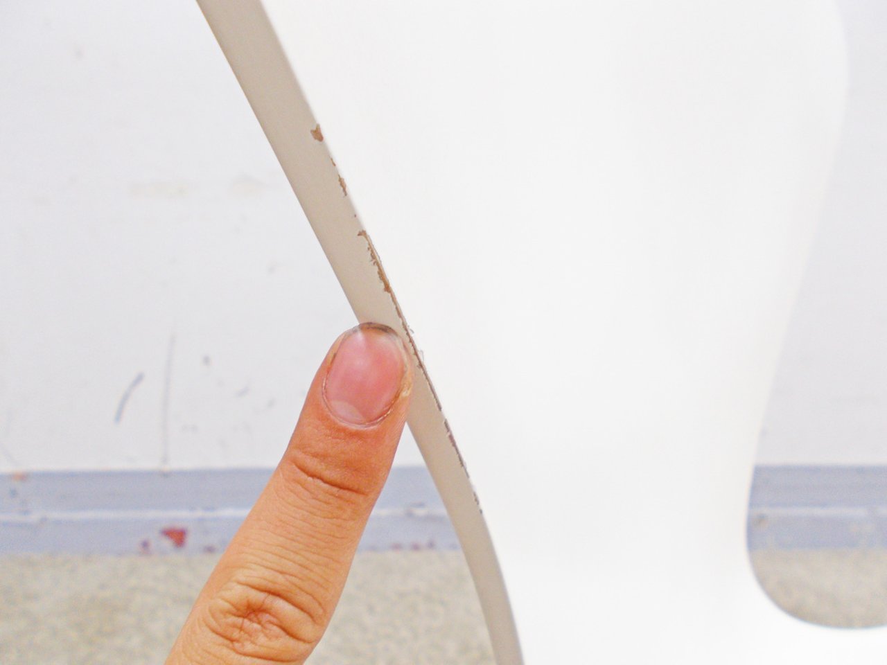- かなり強い濃い黄ばみ・変色が商品全体にある。(例、座面・背もたれ、脚部等にある。)