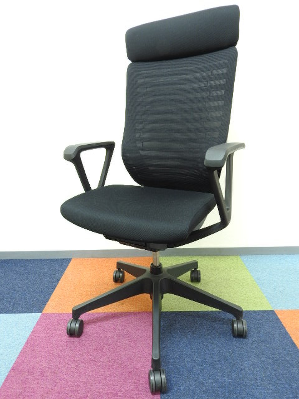 【ヘッドレスト付き!】【1脚限定の為、クレジット決済優先】【姿勢の変化をサポート!操作レスで体格にマッチする定番チェア】■イトーキ(ITOKI)製 エピオスチェア(epios) 肘付き エクストラハイバック 背面メッシュ ■固定肘・ヘッドレスト付 ■ブラック