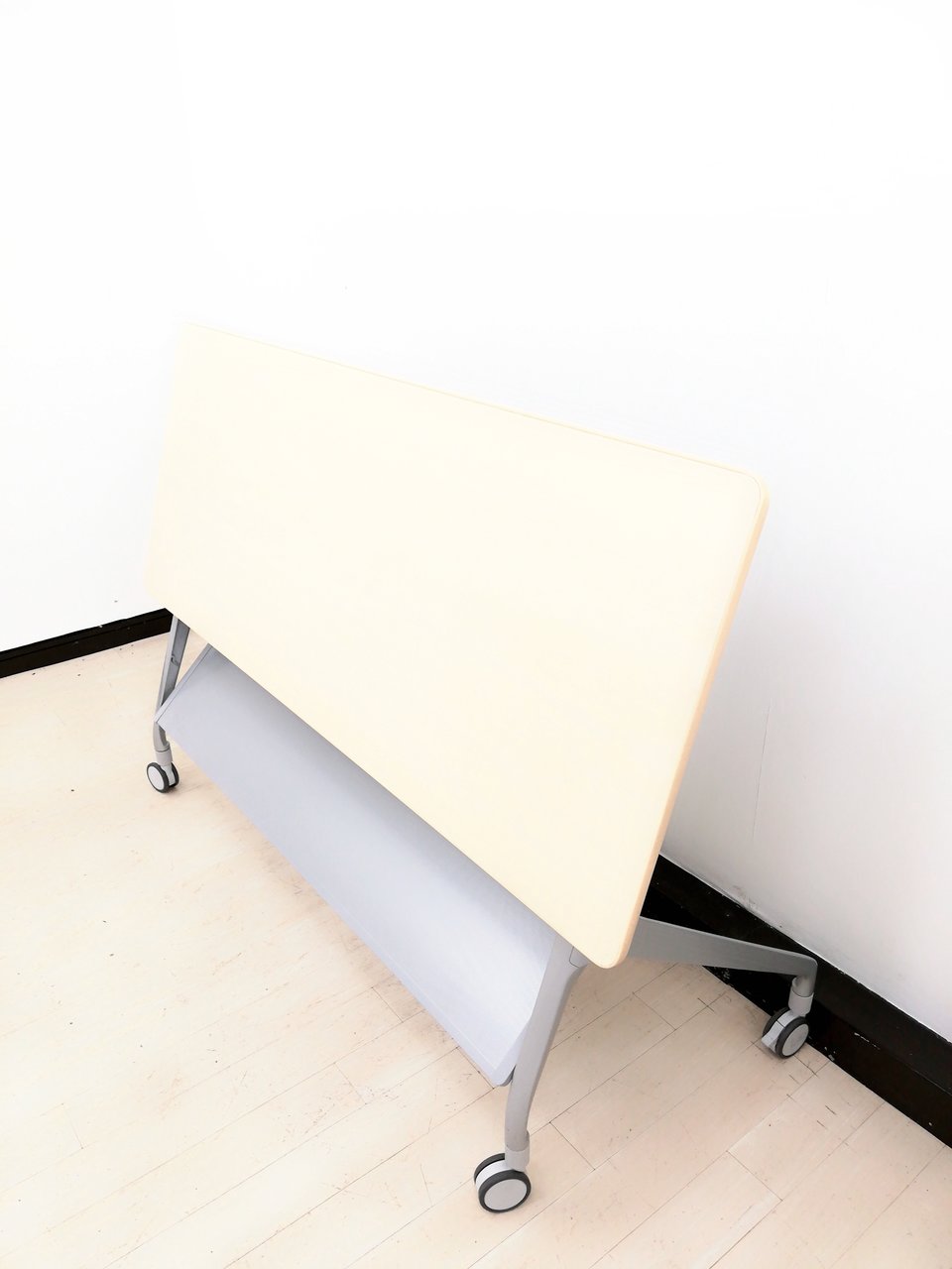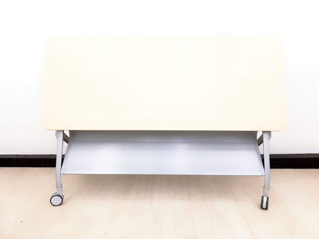 - 一部不具合あり天板歪み、アジャスター無し、キャスター使用不可ようなそのテーブルの本来の効用を果たすための機能以外の一部が使用不可な状態。(例、キャスターロッ ク機能使用不可、棚板無し等がある。)