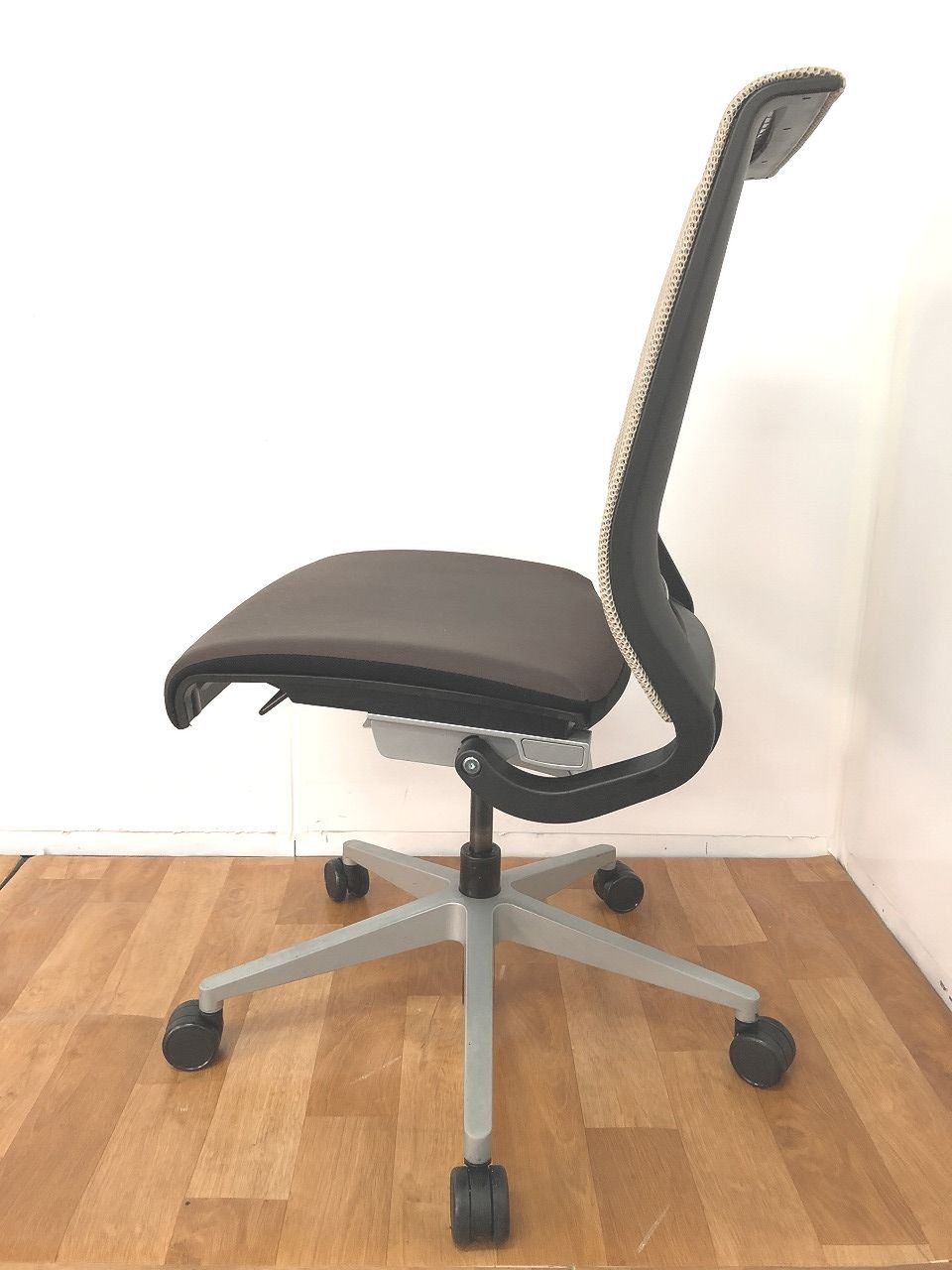 快適な座り心地に不可欠な調節機能である、上下昇降、座面の奥行き調整、リクライニングなどを備えており、操作もわかりやすく好評です。 特に、座面の奥行きは、座面下の左右に通った細いバーで調整でき、座ったままで軽やかに滑るように調整が可能です。 価格面では、新品では高めですが、中古は流通も多く、定価の3割前後の価格で高級チェアの座り心地を手に入れることができます!