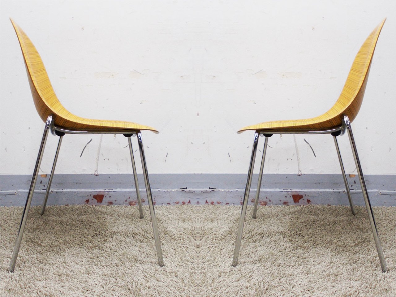 優雅なラインを描くユニークなシェル型の座面が特徴のこのチェアは、突板の美しい木目がナチュラルで温もり溢れる雰囲気を醸し出しています。