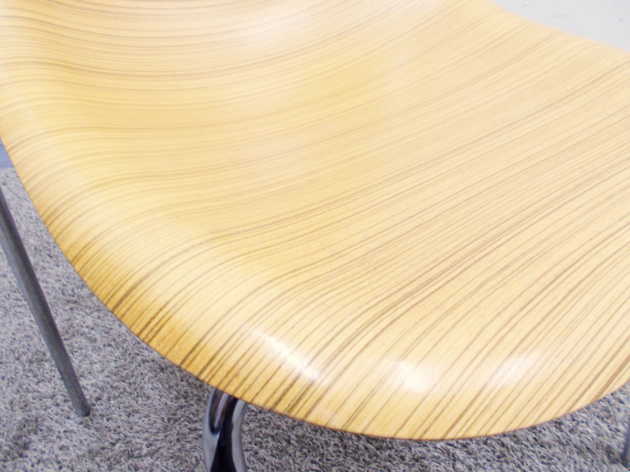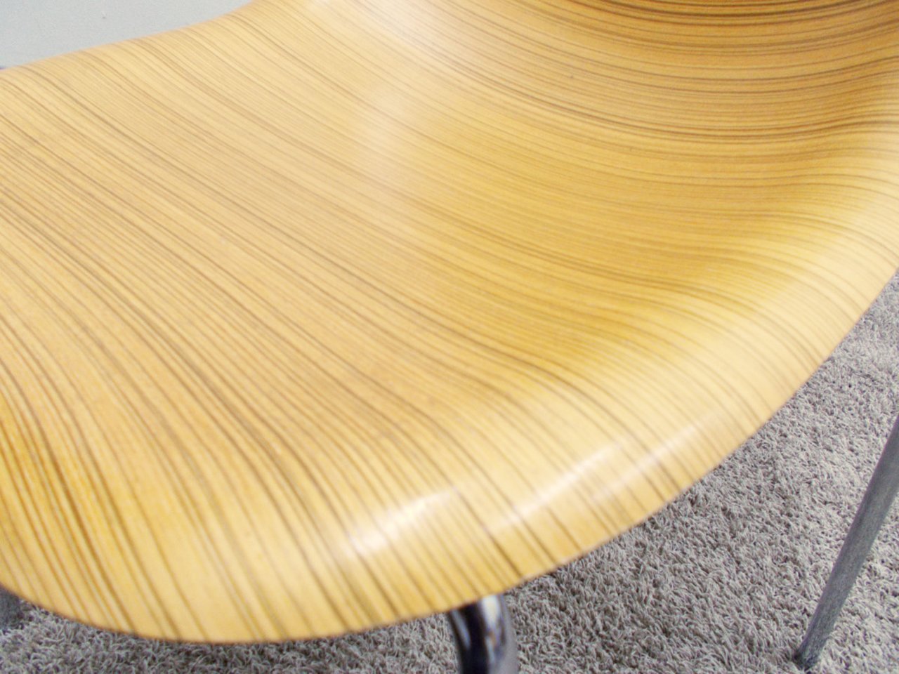 優雅なラインを描くユニークなシェル型の座面が特徴のこのチェアは、突板の美しい木目がナチュラルで温もり溢れる雰囲気を醸し出しています。