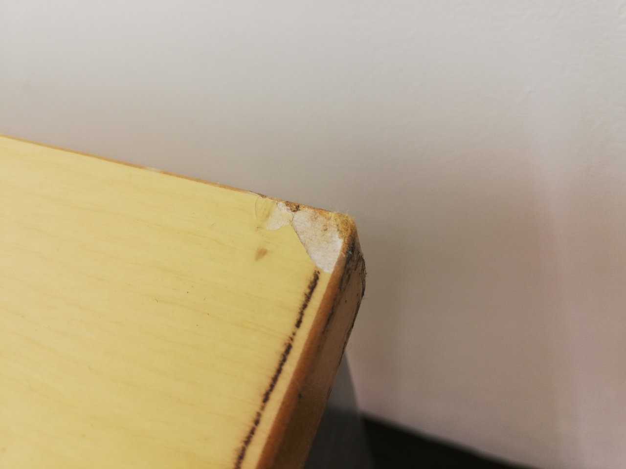 - かなり強い濃い黄ばみ・変色が商品全体にある。(例、天板、幕板、棚板、サイド部分、脚部等にある。)
