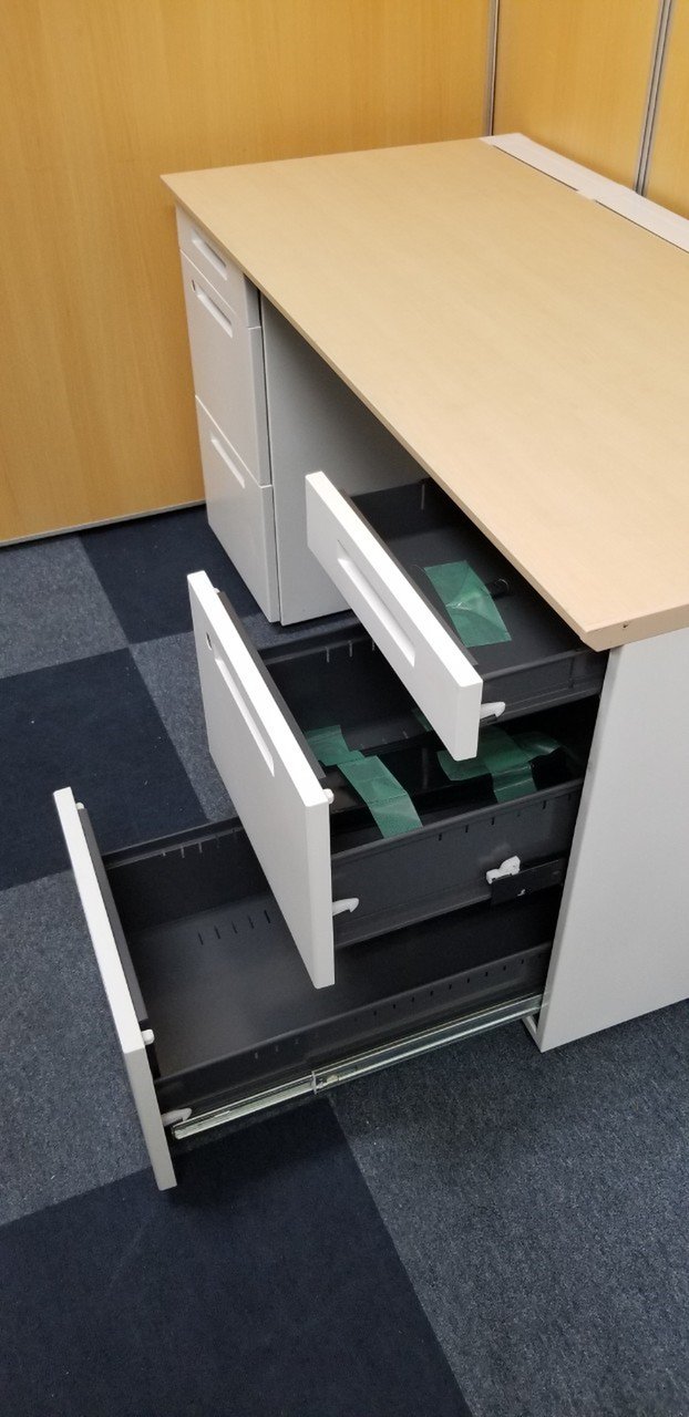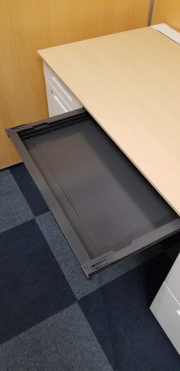 - 地震時、センター引出しが飛び出さないよう、ラッチ機構を装備。脚はデスクの横ズレを軽減させる設計になっています。