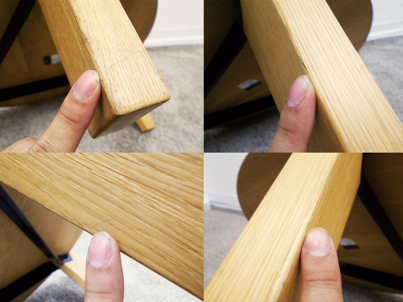 - 目立つ箇所あり傷・凹みが多数、深い傷・凹みが一部ある。(例、天板、幕板、棚板、サイド部分、脚部等にある。)