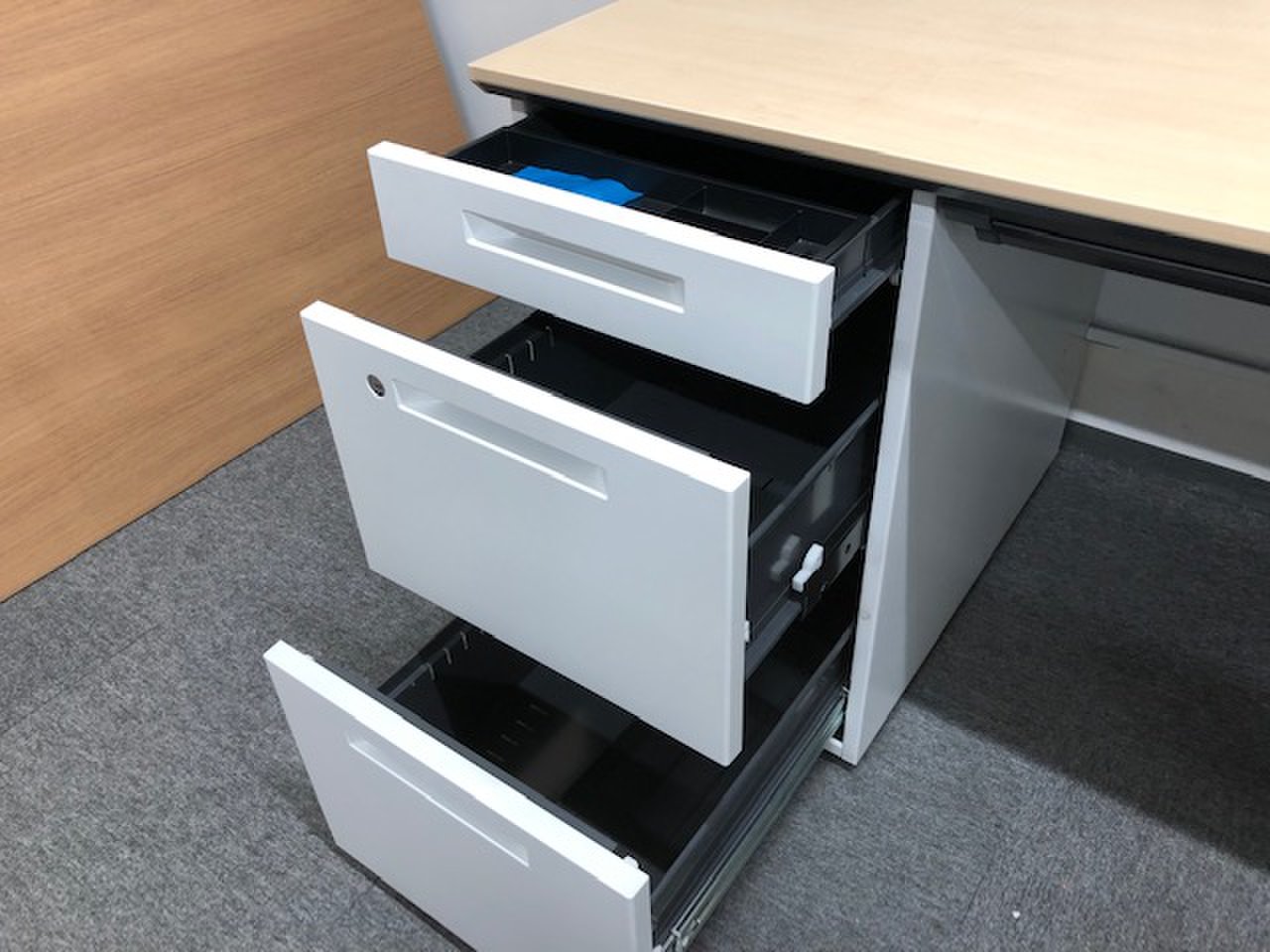 - 地震時、センター引出しが飛び出さないよう、ラッチ機構を装備。脚はデスクの横ズレを軽減させる設計になっています。