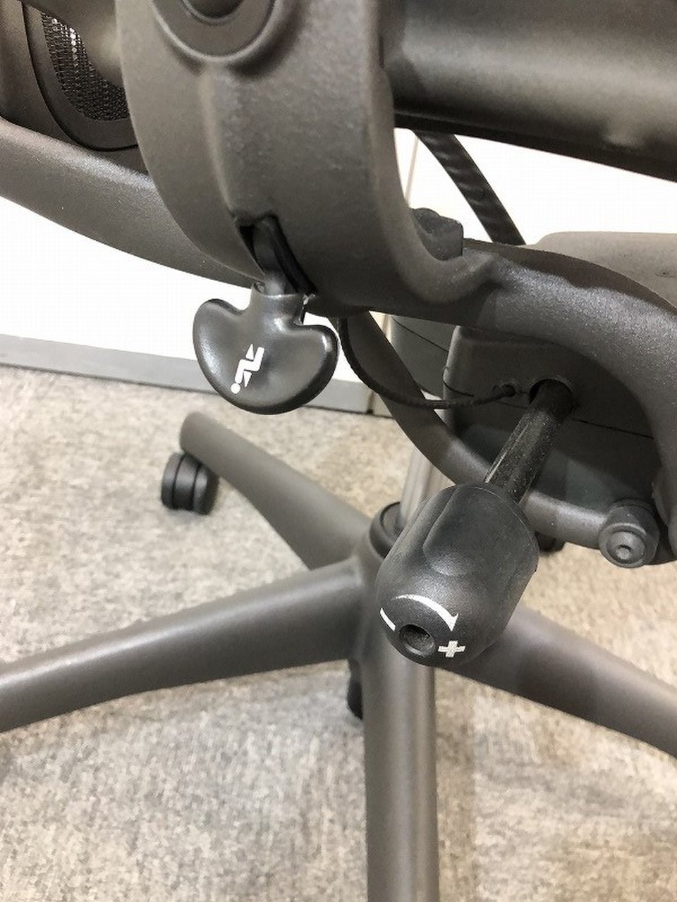 - ノブを+方向に回すと背もたれのリクライニング が硬くなり、-方向に回すと柔らかくなります。