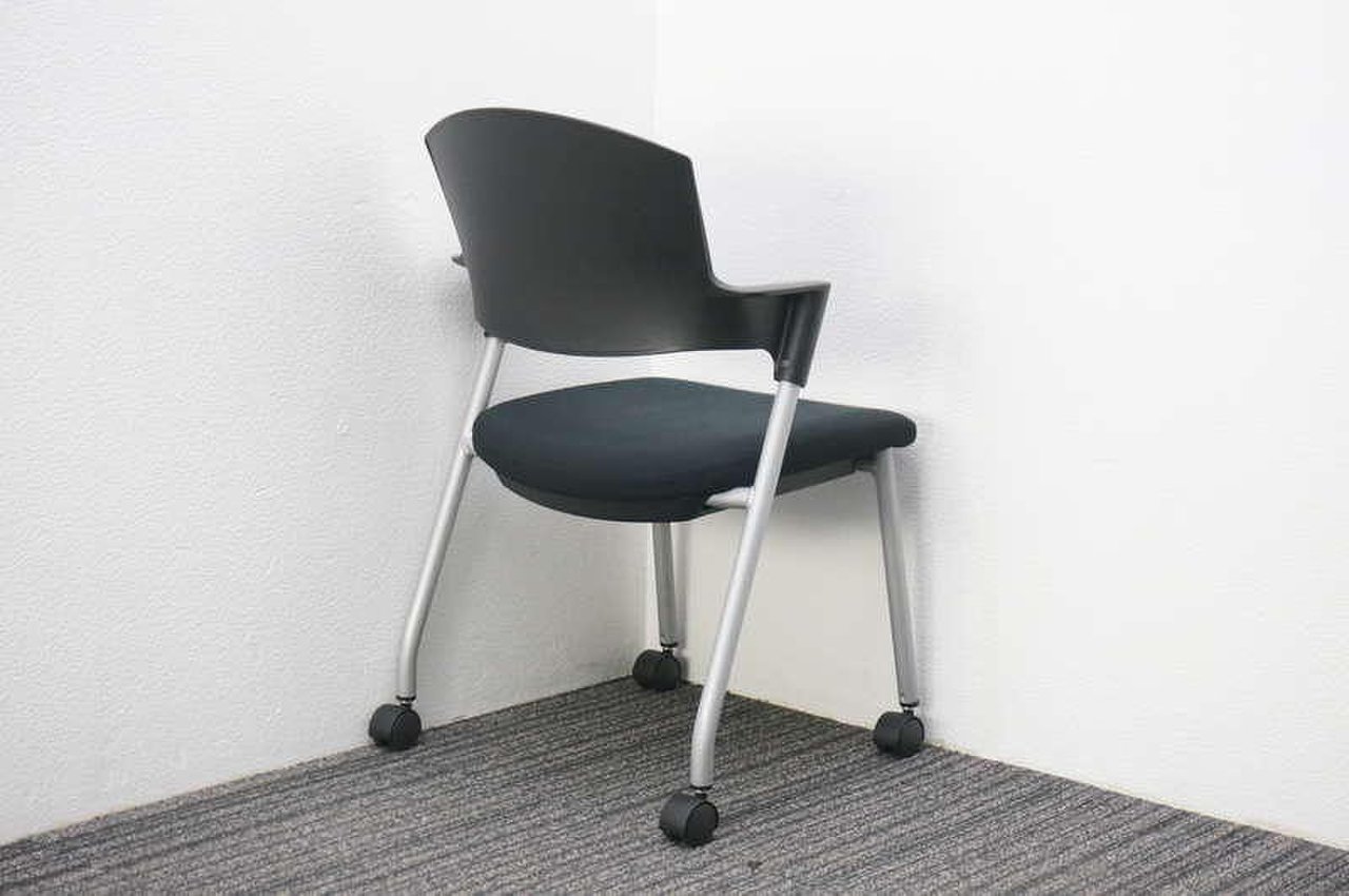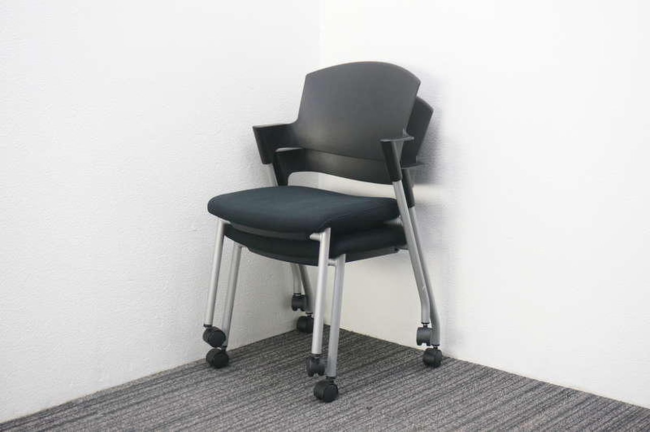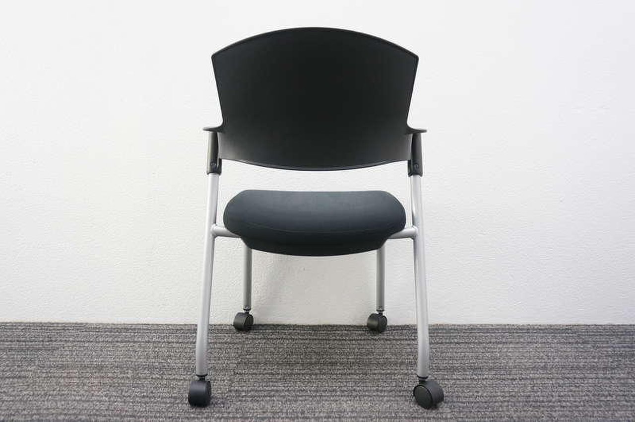 【シンプルスマートなスタッキングチェア!分厚いクッションで長時間でも快適な座り心地!】■スタッキングチェア 肘付ミーティングチェア ■固定肘 ■キャスター付 ■ブラック ■背面樹脂/コクヨ(KOKUYO/プロッティ